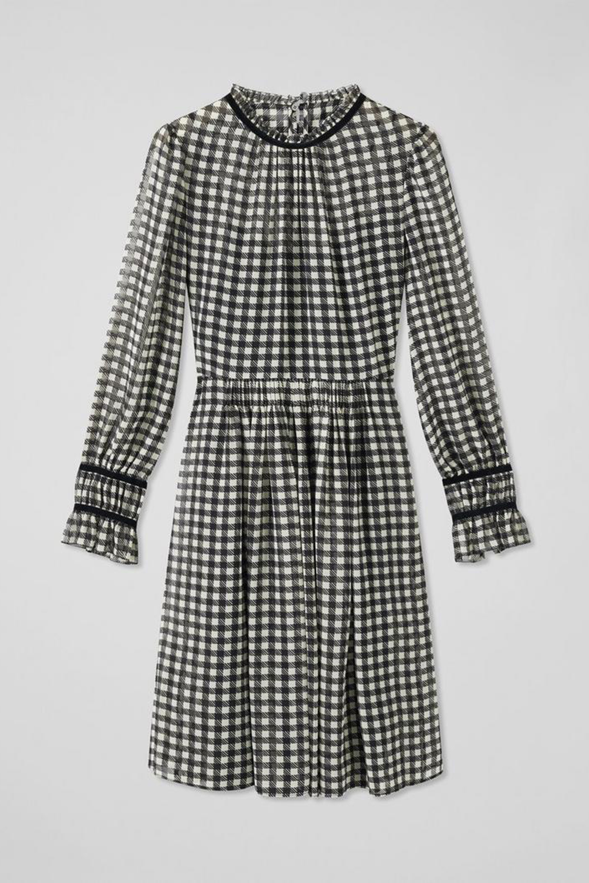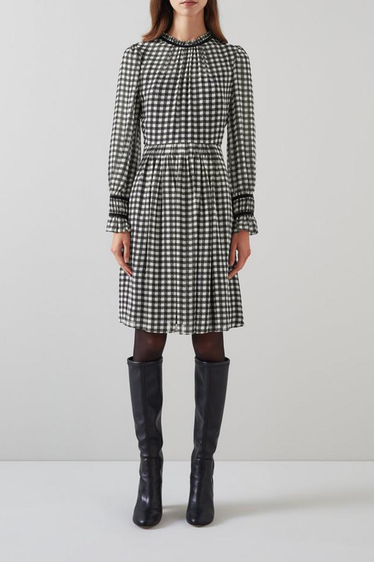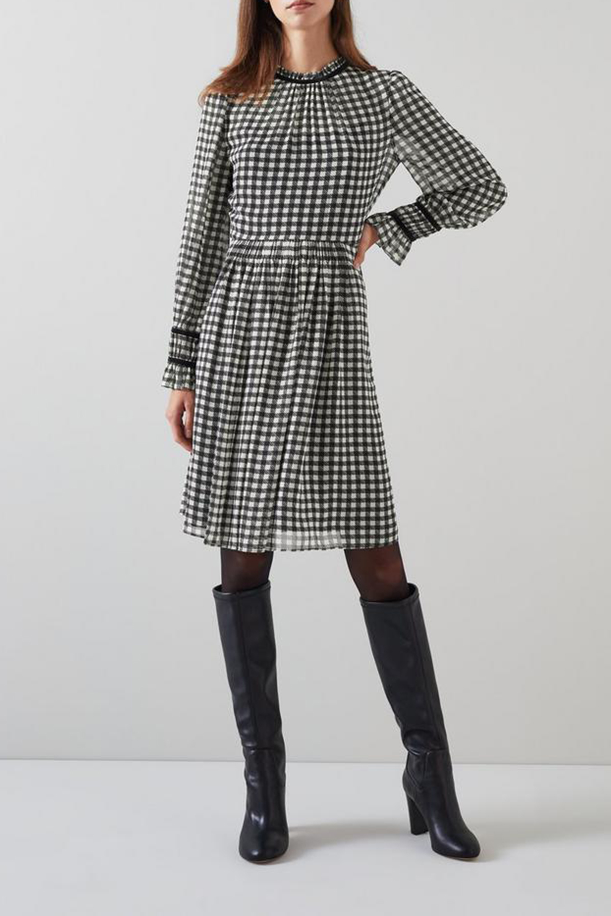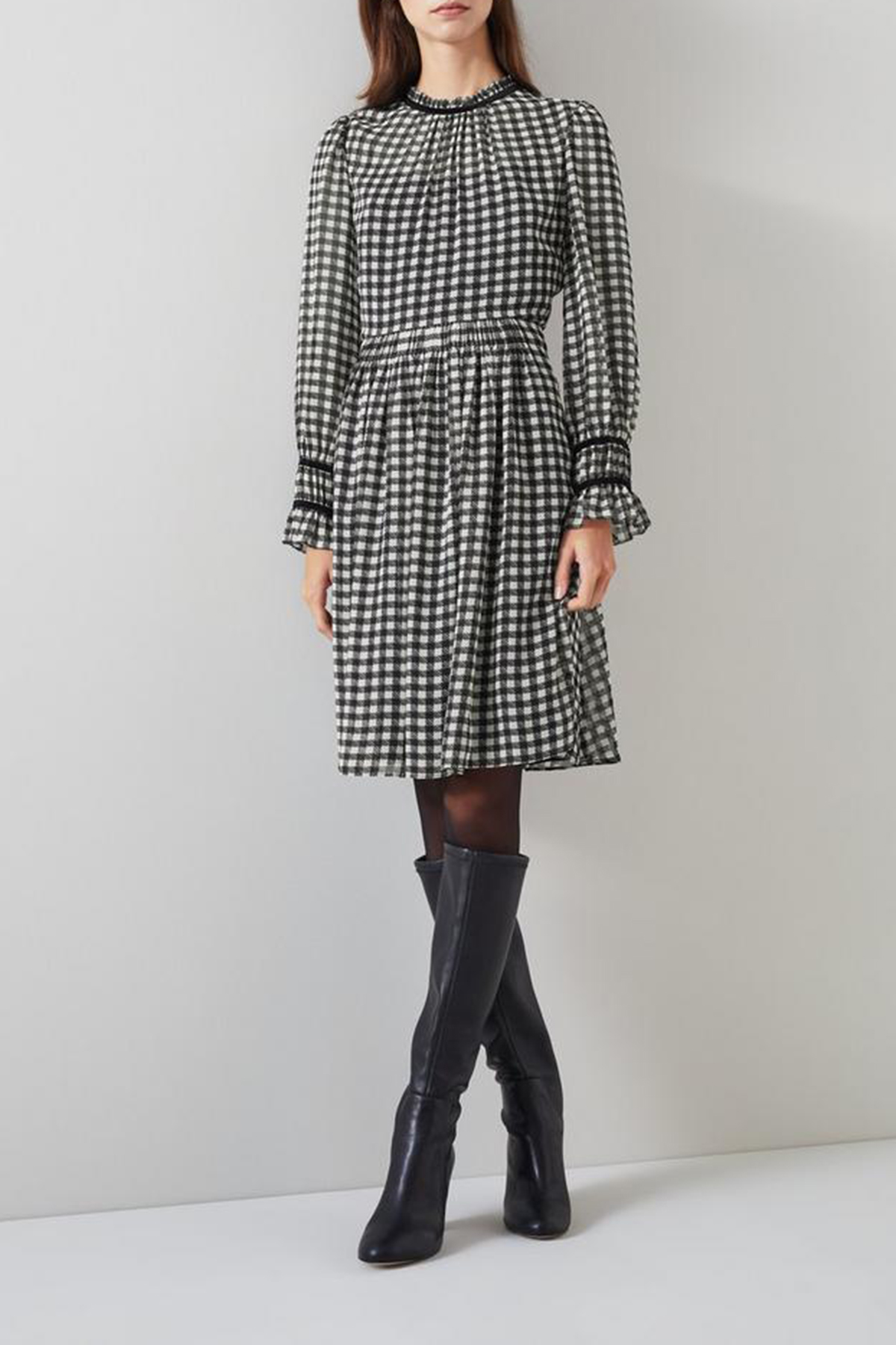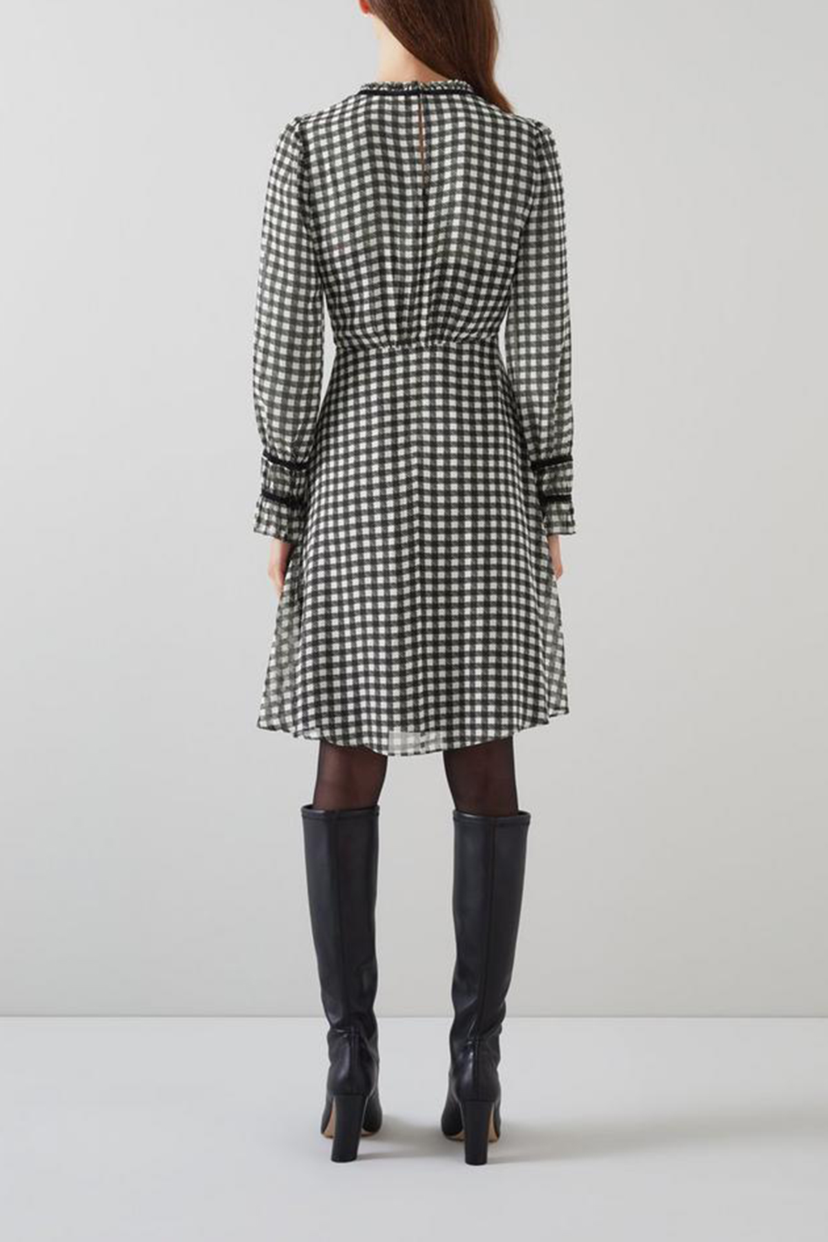 Experience sophistication, a stylish gingham printed dress in timeless black, crafted from high-quality fabric and adorned with a luxurious velvet ribbon trim and back button detail. Its smart casual design featuring a crew neck and full length sleeves effortlessly blends classic and contemporary styles. Perfectly pair it with sleek heels or ankle boots for a refined look.