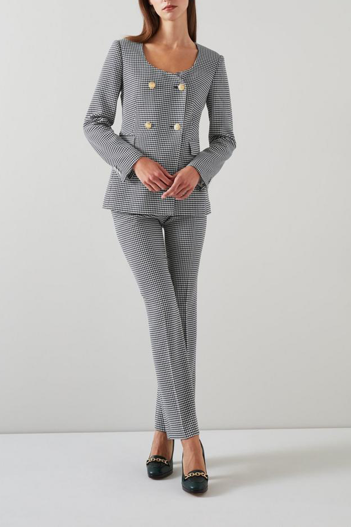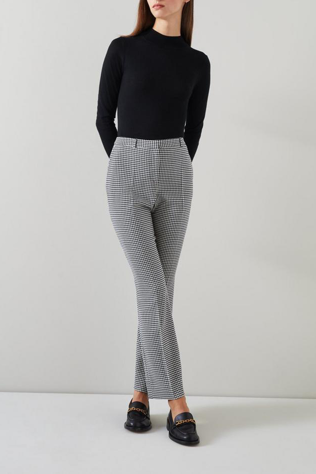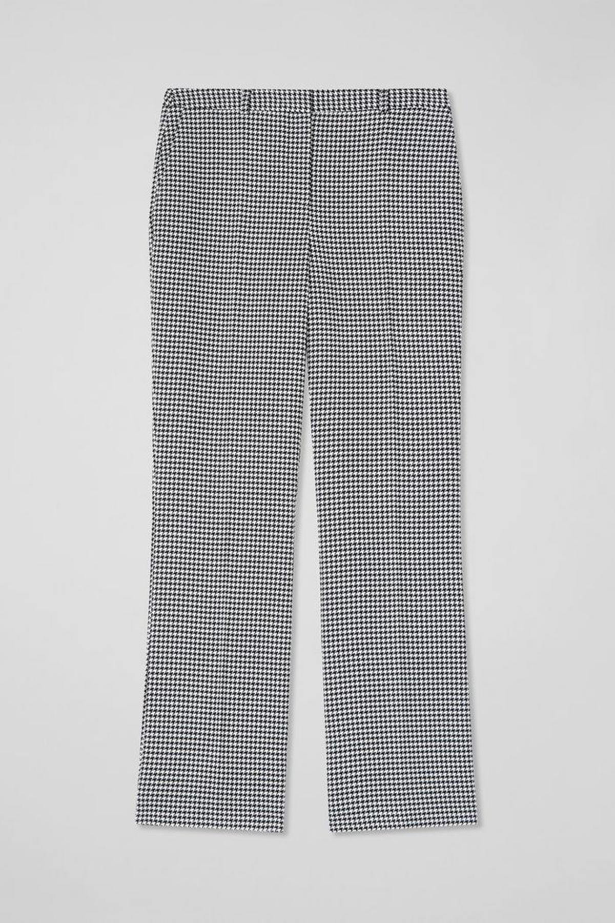 Imagine stepping into your office with effortless elegance. The houndstooth bootcut trousers in black, crafted from a luxurious fabric blend, feature intricate Portuguese cloth, a front zip, and a hook-and-eye fastening. Perfectly pair with a crisp white blouse or a tailored blazer for a sophisticated look.