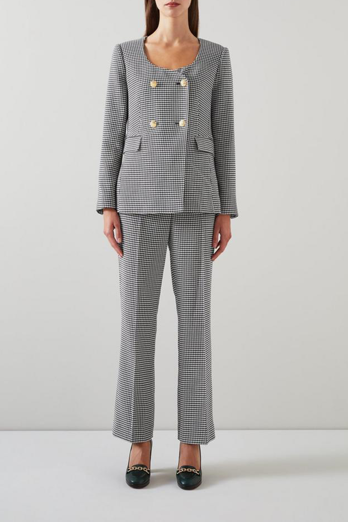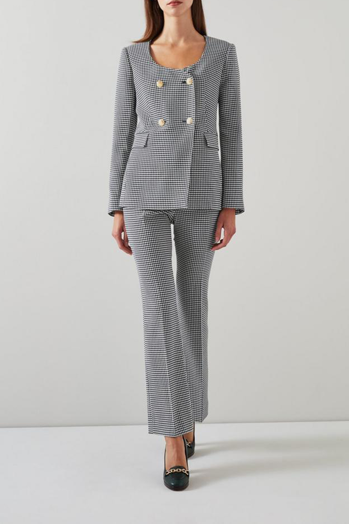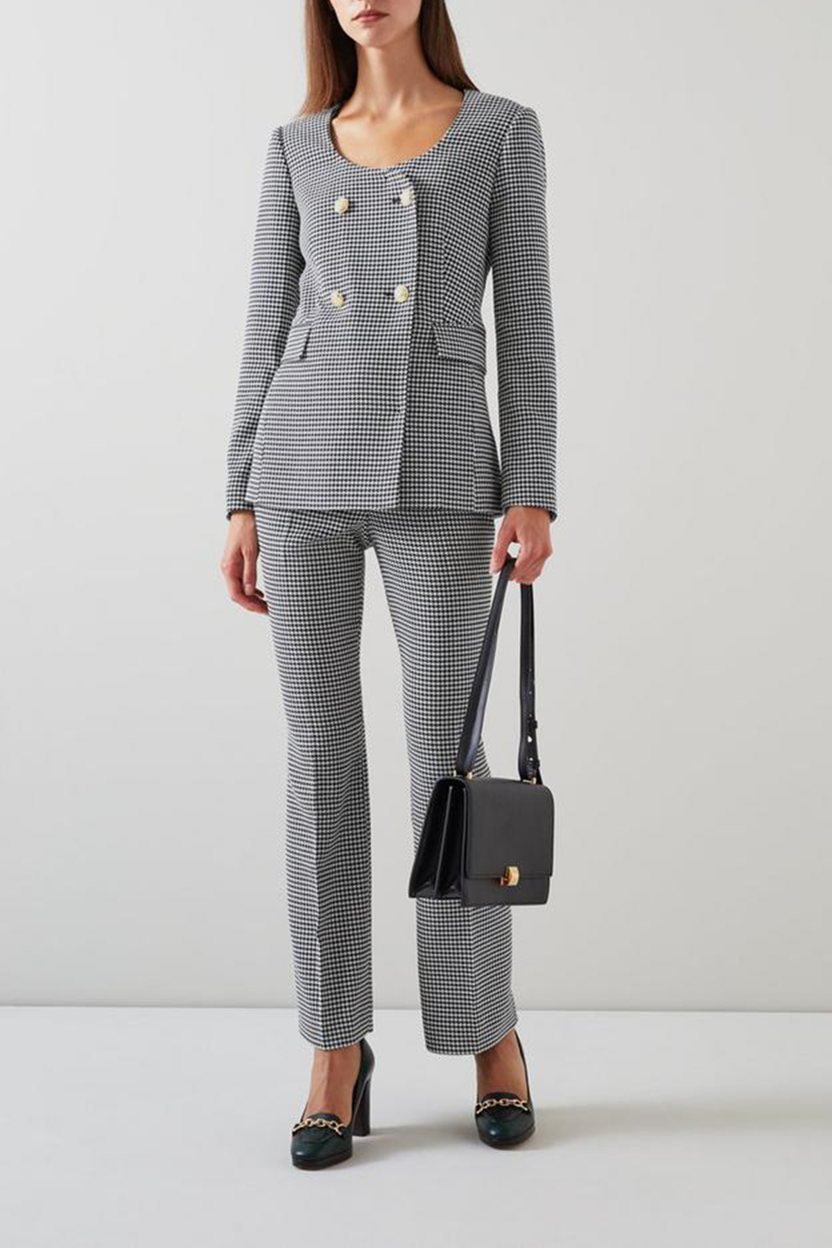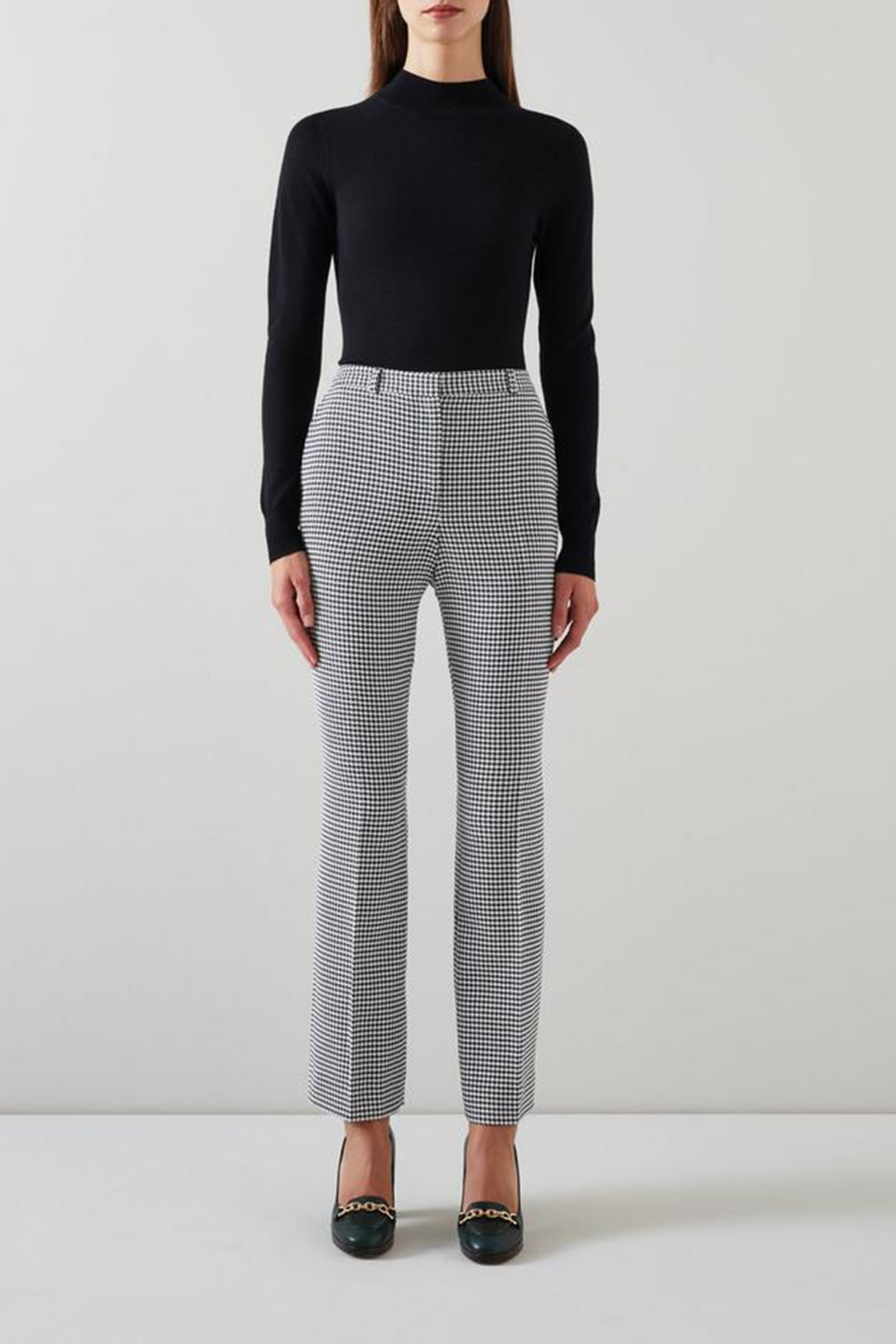 Imagine stepping into your office with effortless elegance. The houndstooth bootcut trousers in black, crafted from a luxurious fabric blend, feature intricate Portuguese cloth, a front zip, and a hook-and-eye fastening. Perfectly pair with a crisp white blouse or a tailored blazer for a sophisticated look.