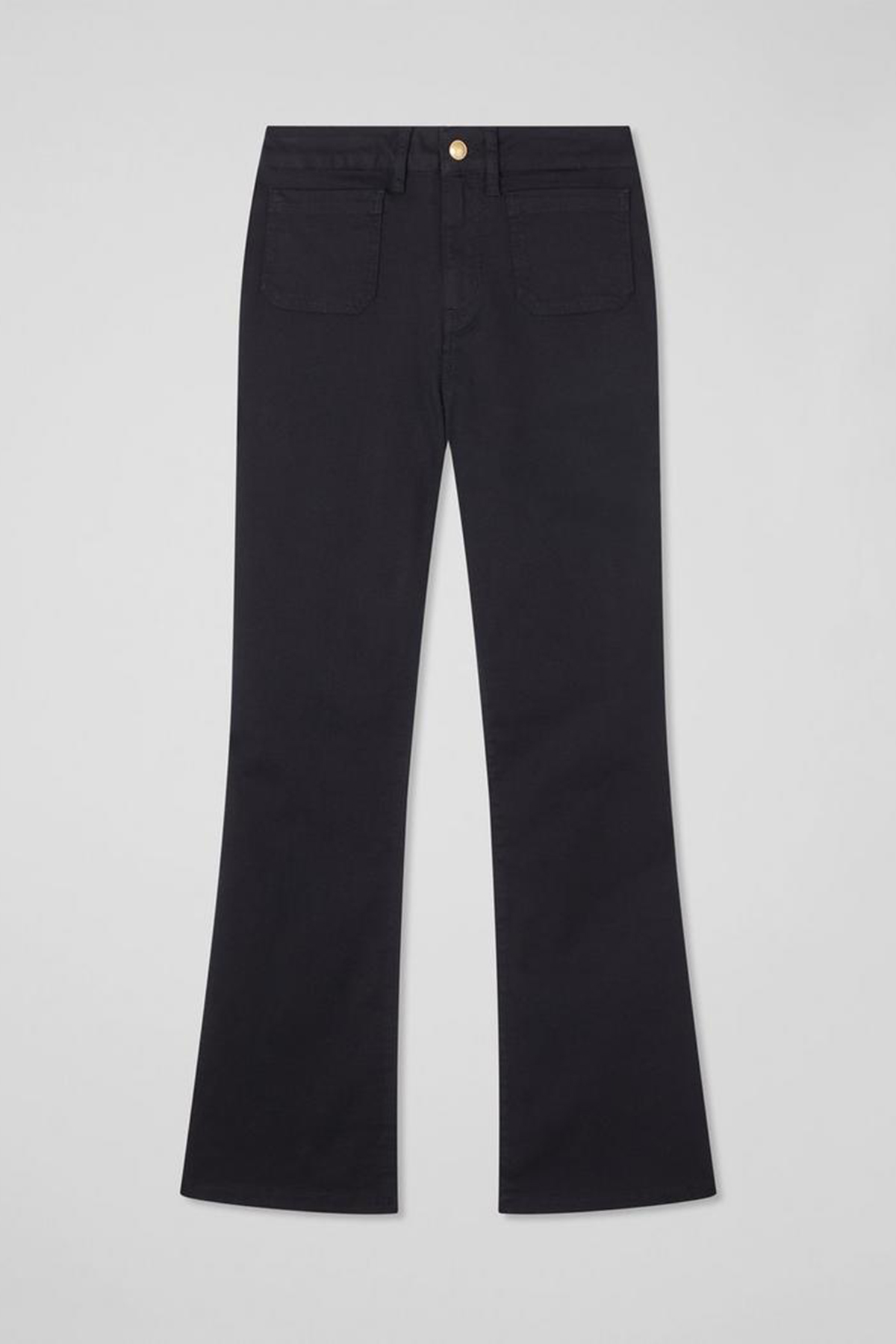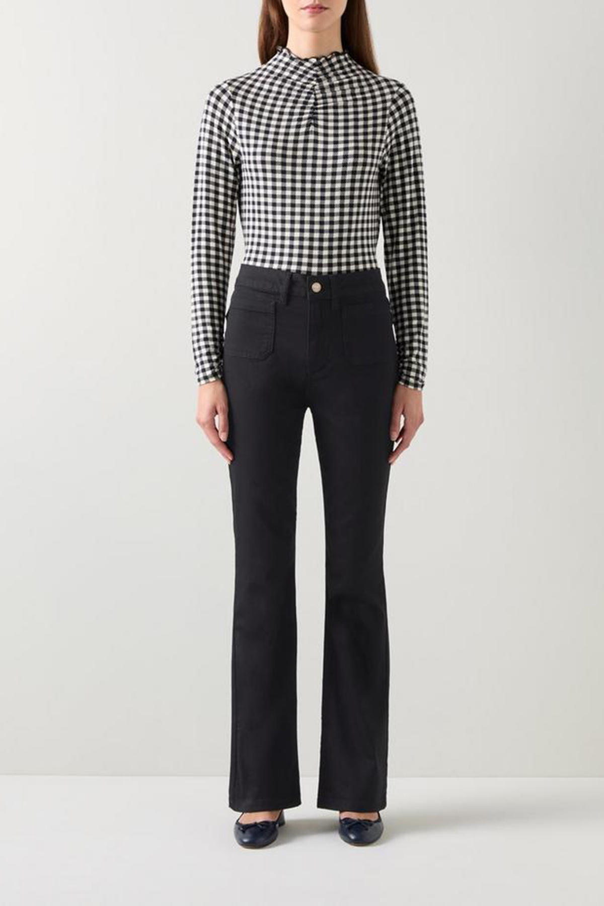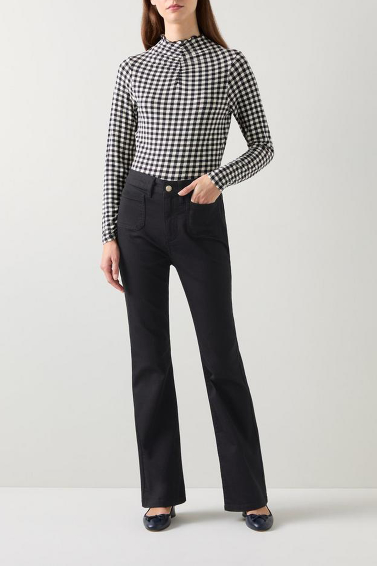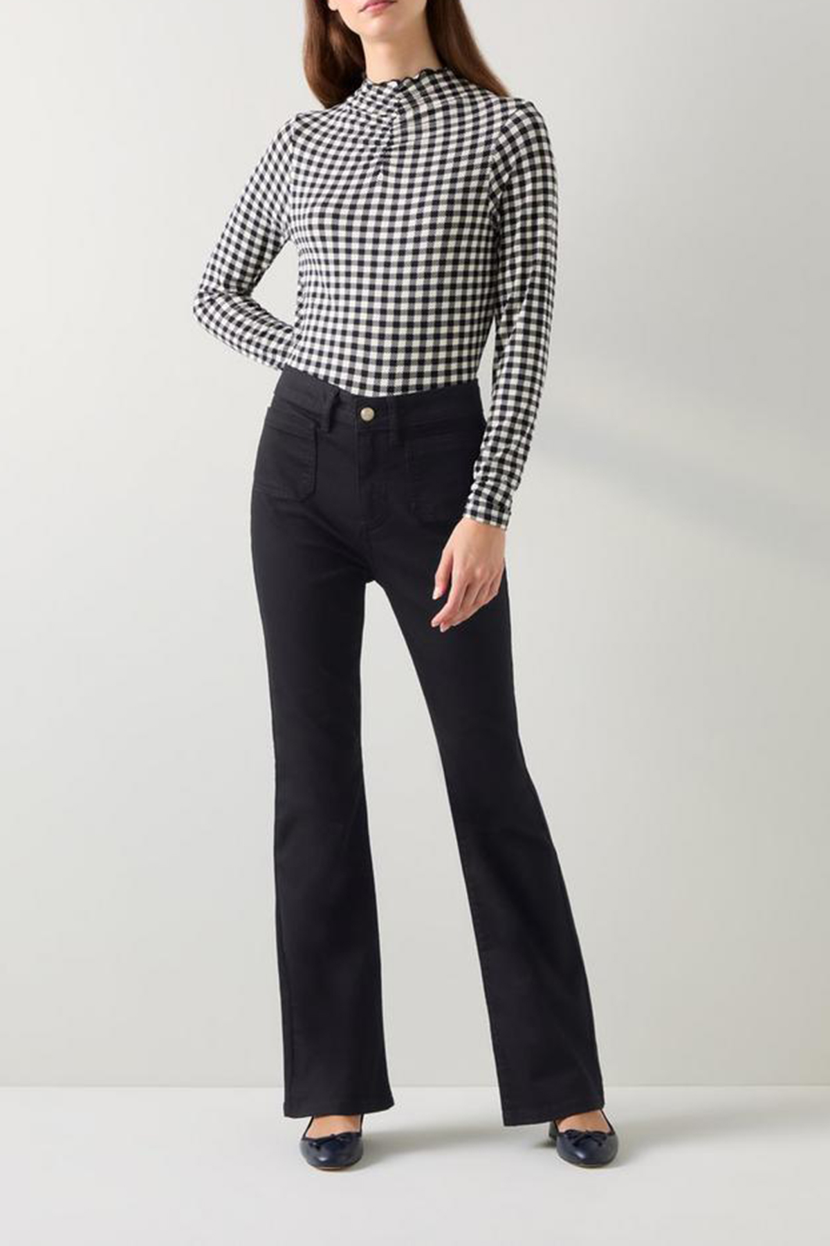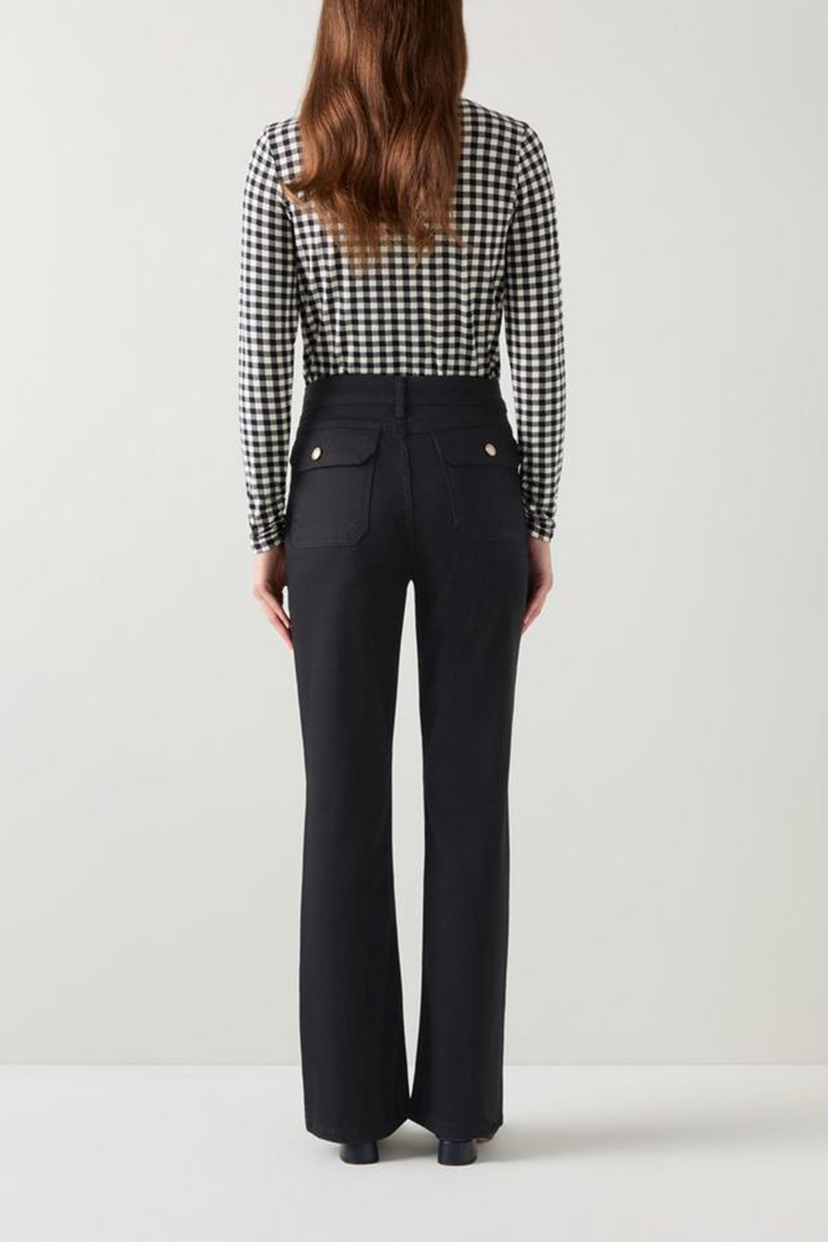 Step out with confidence in these high waist patch pocket stretch denim kickflare jeans. In classic black, they are crafted from a high-quality cotton mix, featuring a smart casual design perfect for any occasion. Pair effortlessly with a crisp blouse and heels for a sharp look or dress down with a cosy jumper and trainers.