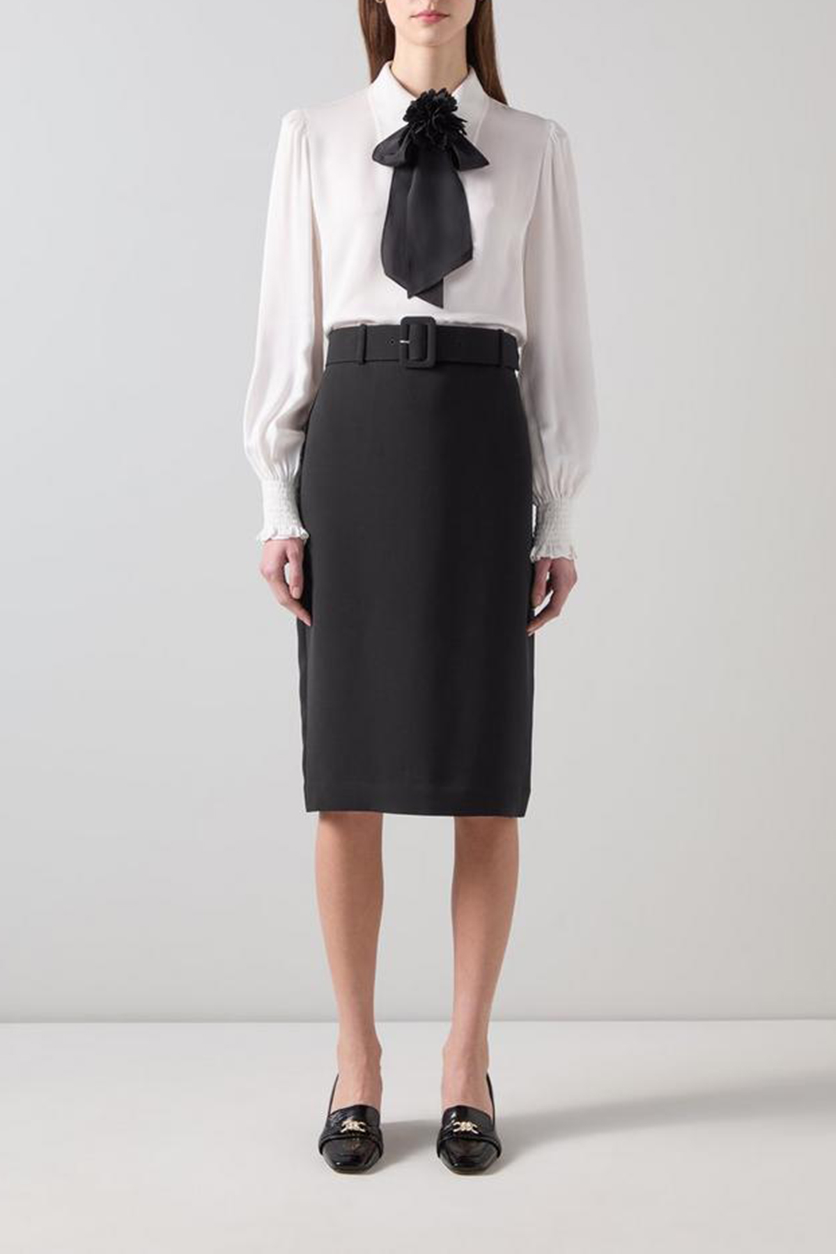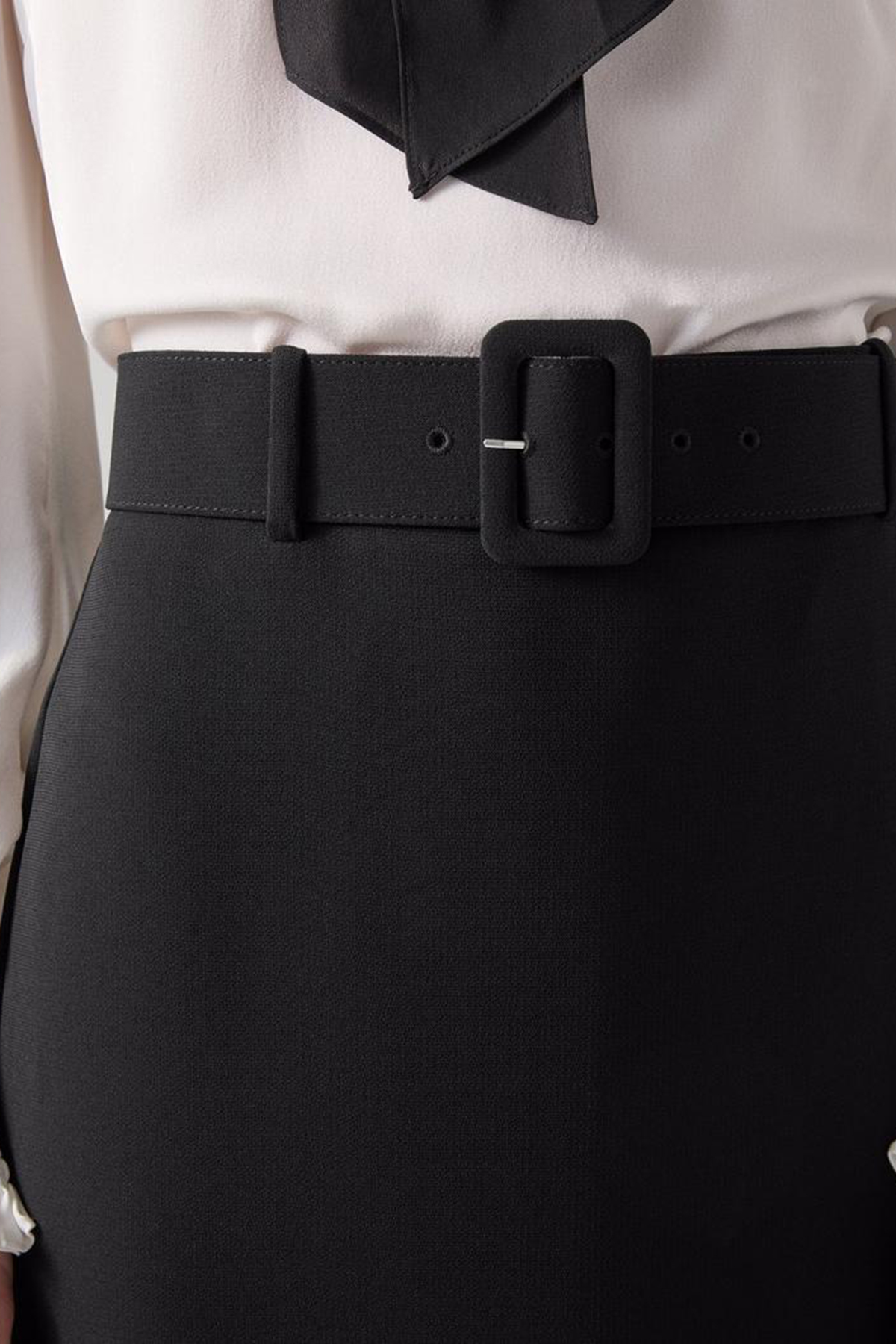 Elevate your style with our belted crepe pencil skirt. This black woven beauty features a removable belt and back zip, crafted from high-quality fabric for your workwear wardrobe. Perfectly pair it with a crisp white blouse or a stylish blazer for an effortlessly polished look.