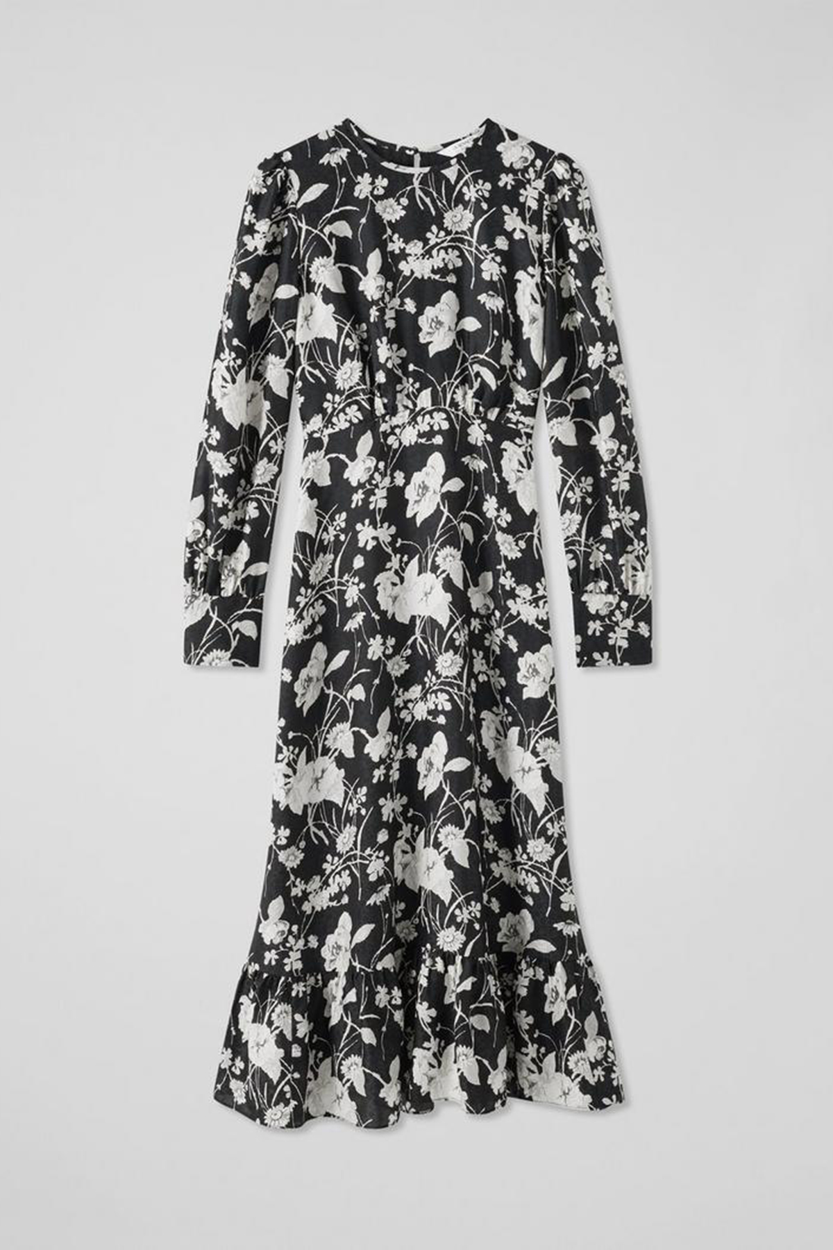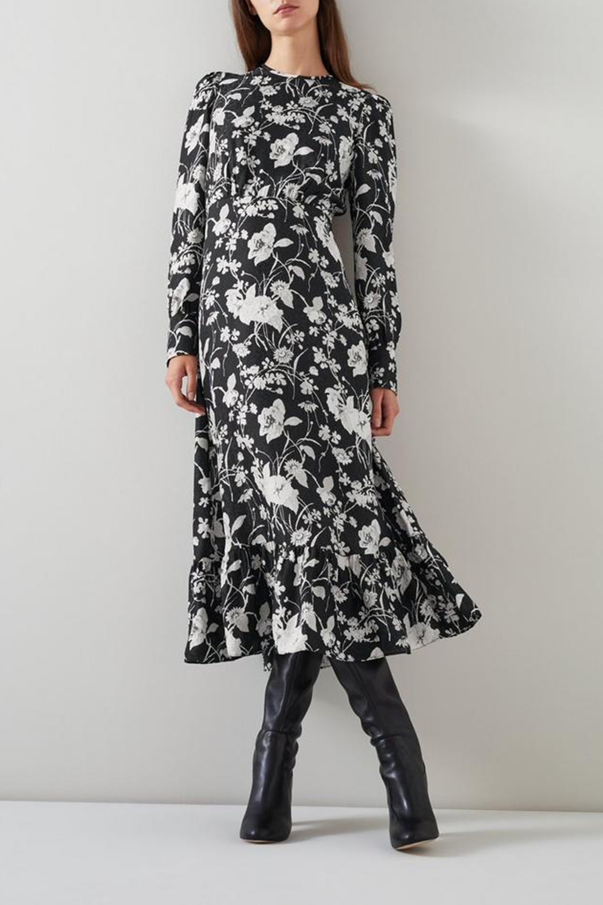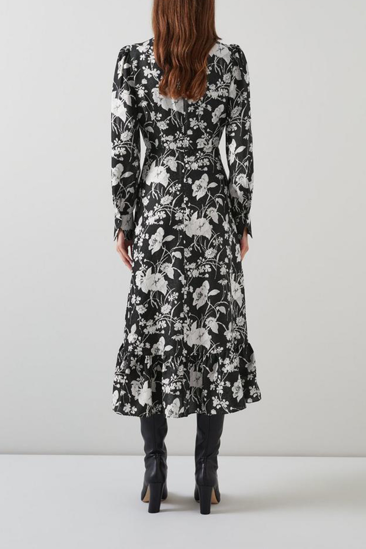 Embrace a night of elegance with the mono meadow print jacquard dress. This black silk mix beauty features a sophisticated floral design, complete with back buttons, a zip, and a timeless crew neck. Pair it with your favourite heels or statement jewellery for a truly captivating look.