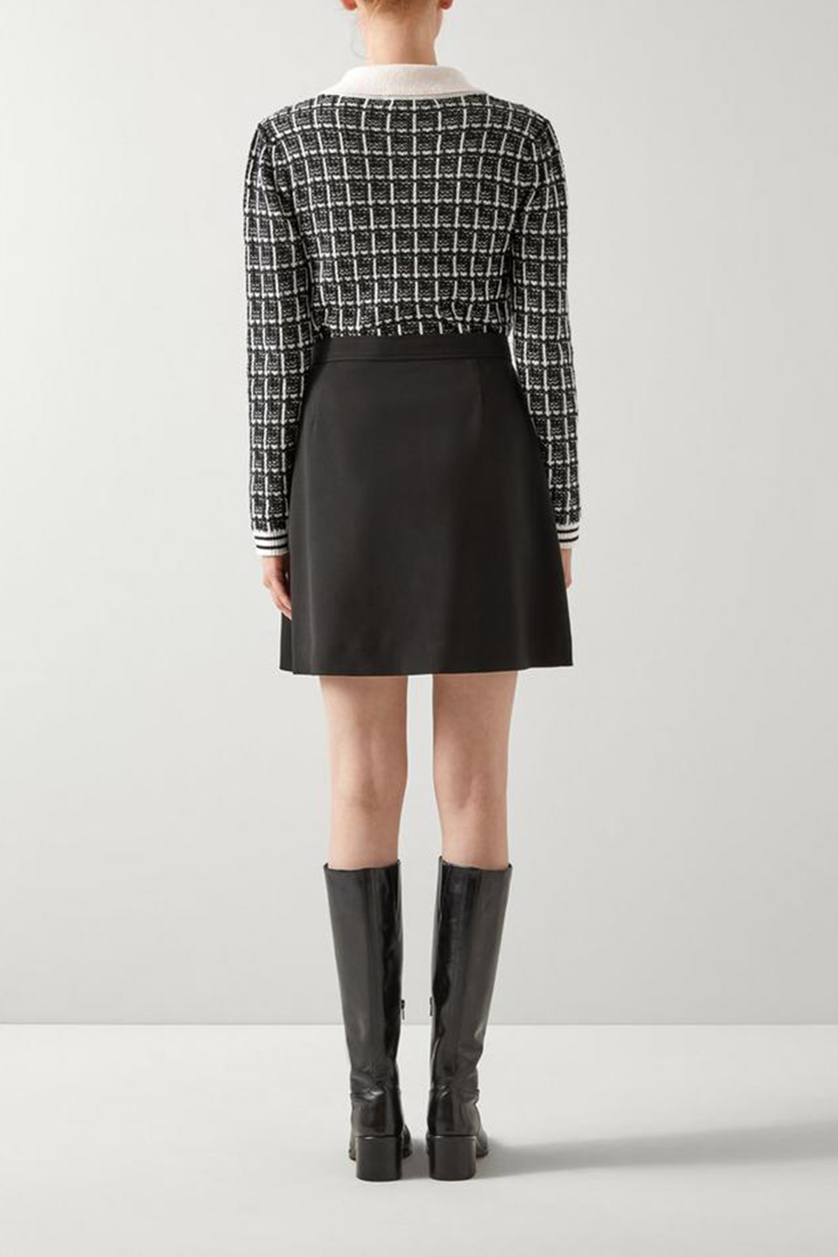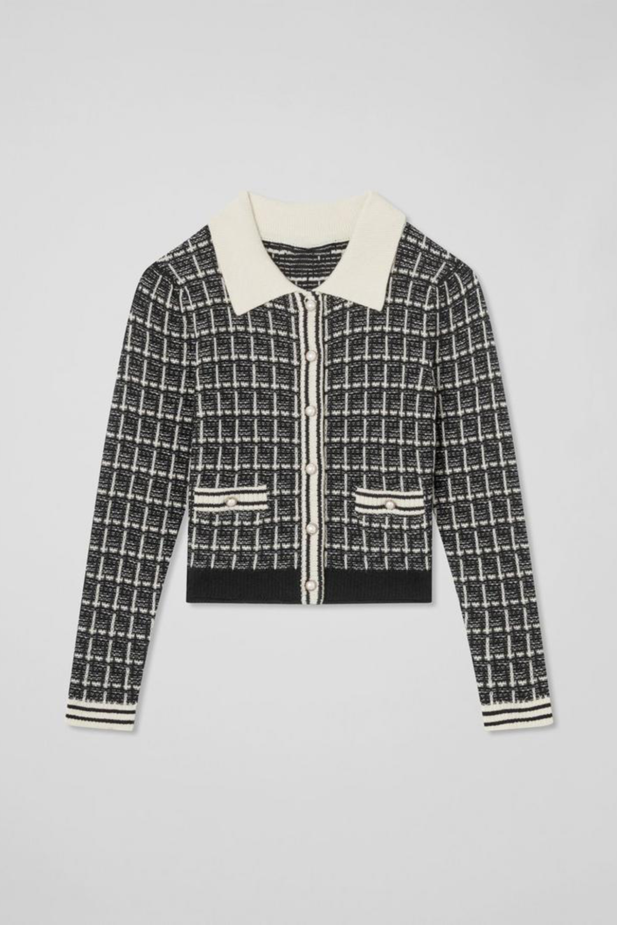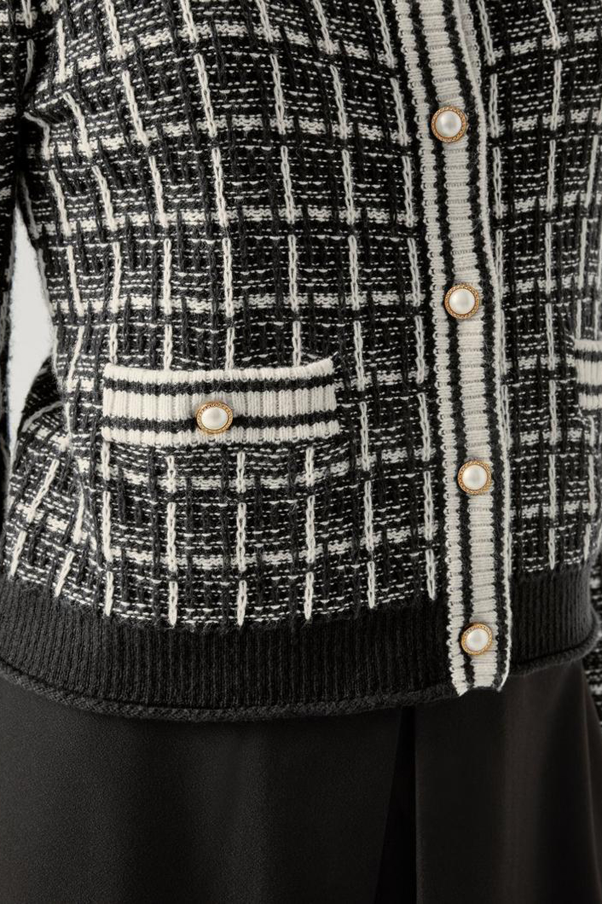 Imagine being wrapped in elegance with the mono knit collar jacket in timeless black. This smart casual cardigan, crafted from a luxurious cotton mix, features exquisite pearl detail buttons and a refined collar design. Perfectly pair it with tailored trousers or a stylish midi skirt for an effortlessly sophisticated look.