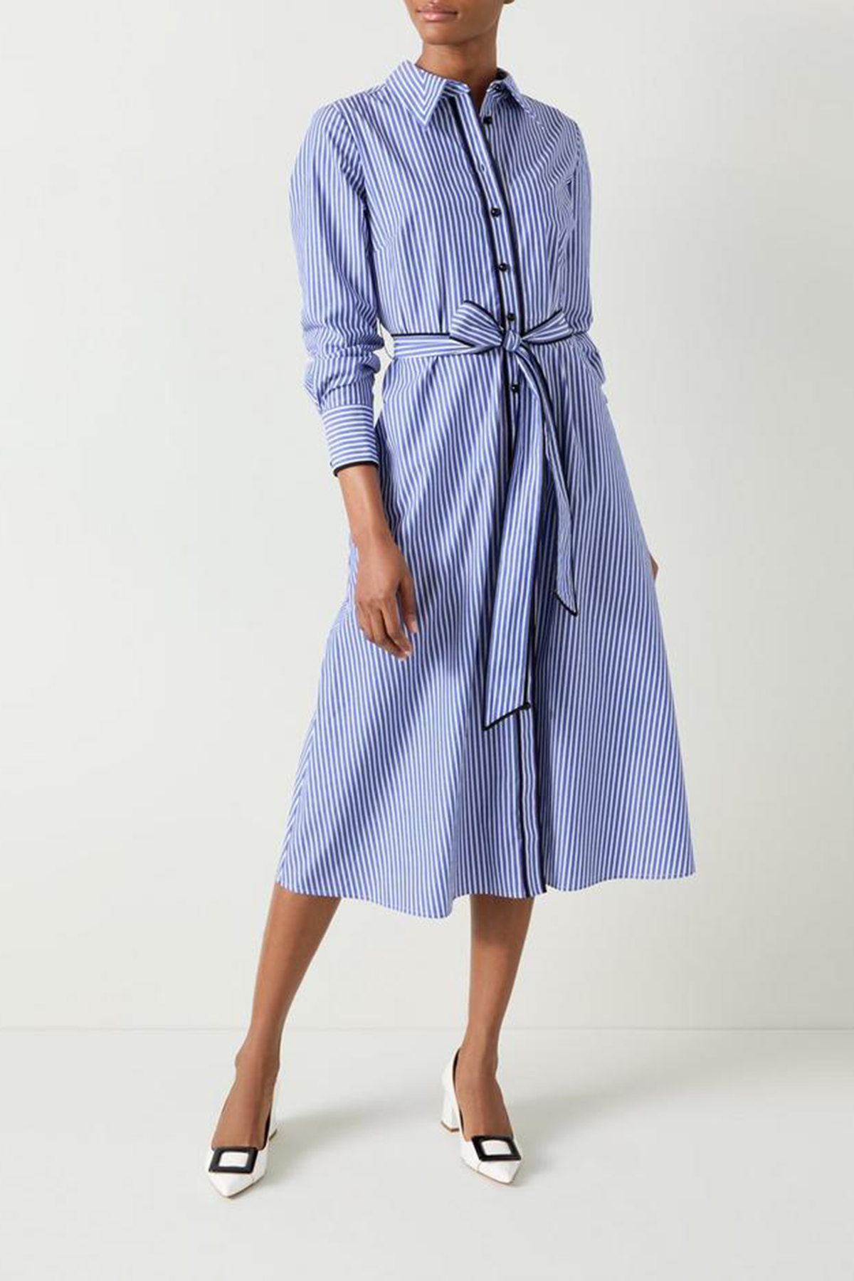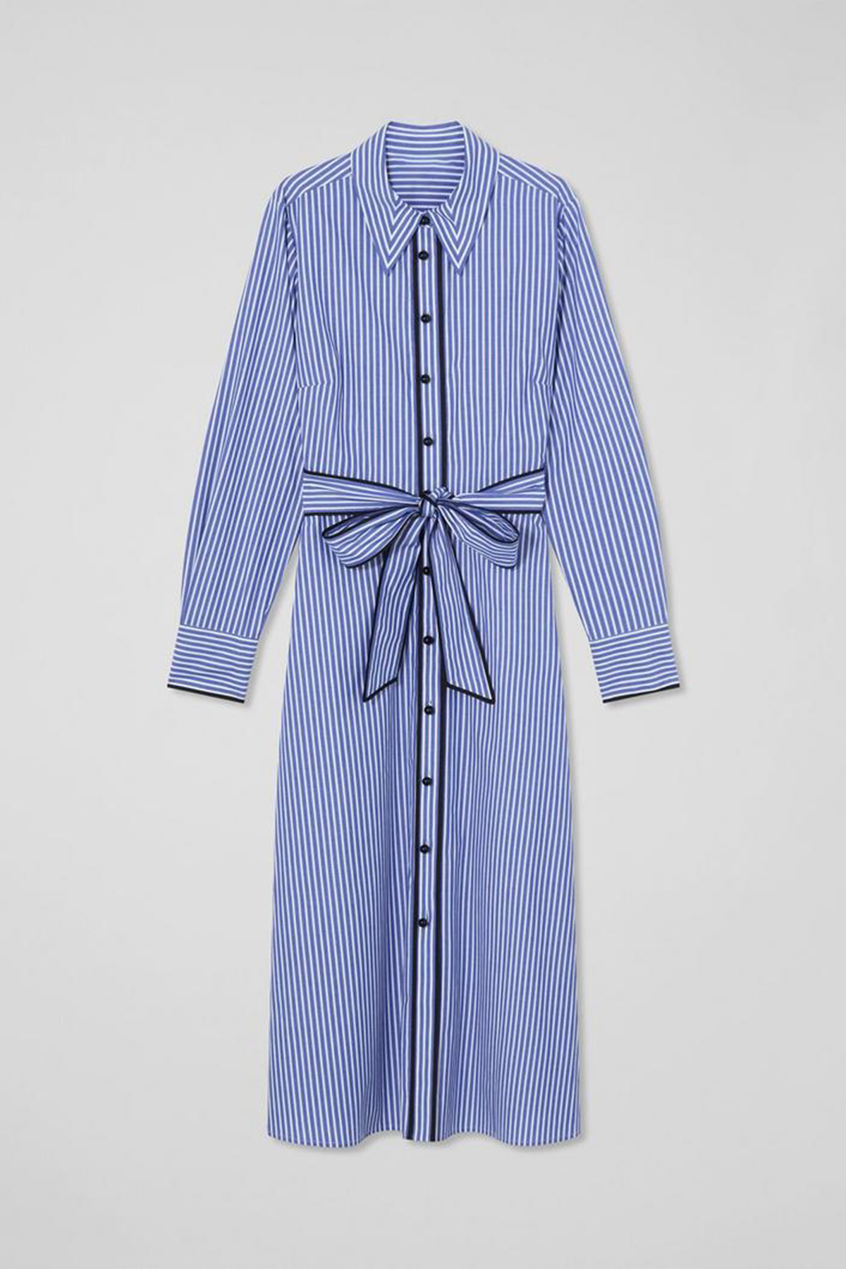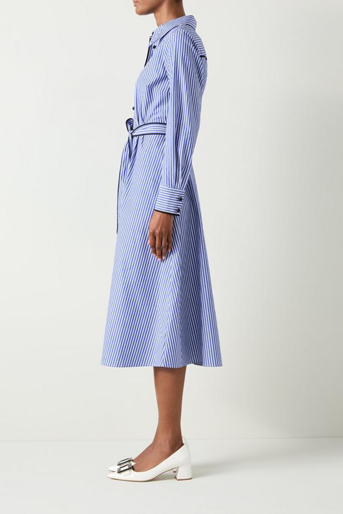 The striped cotton shirt dress merges traditional elegance with contemporary style. This piece is made from breathable cotton adorned with blue and white stripes and includes contrast binding, ball button details, and pockets. Ideal for both office settings and weekend activities, complement it with trainers for a relaxed ensemble, or elevate it with heels and bold jewelry for evening events.