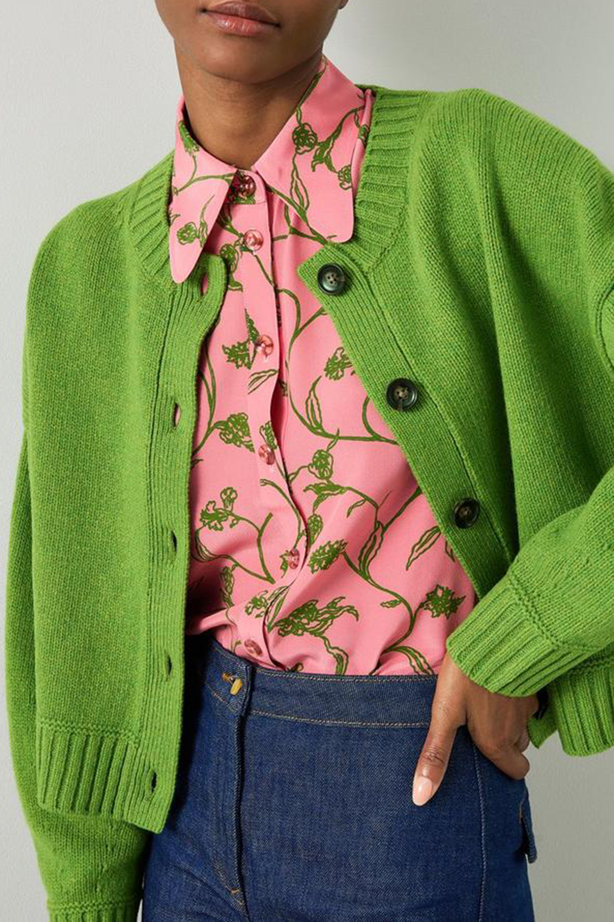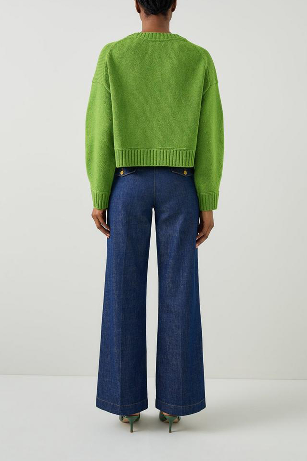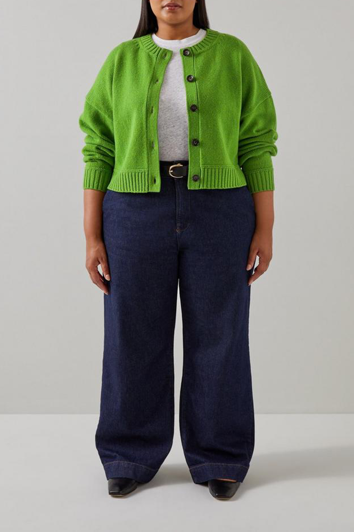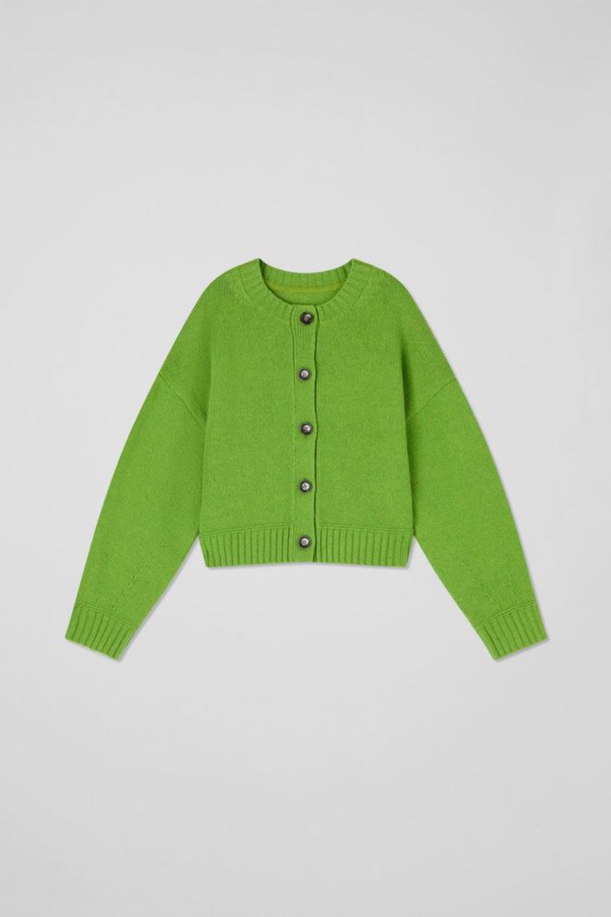 Brighten up your wardrobe with a pop of vibrant bright green. The chunky brushed short cardigan, crafted from luxurious wool, features a classic crew neck and full length sleeves – perfect for smart casual ensembles. Pair it with tailored trousers or your favourite jeans for an effortless look.