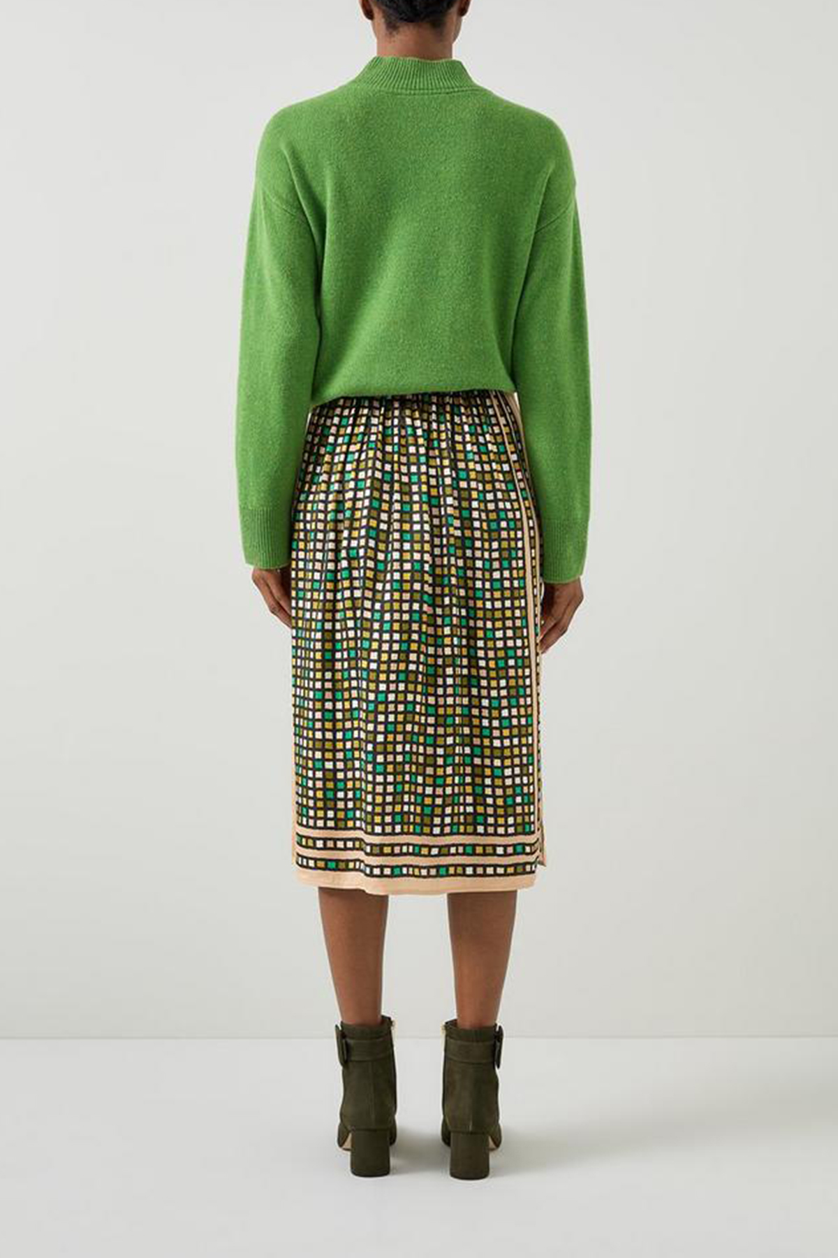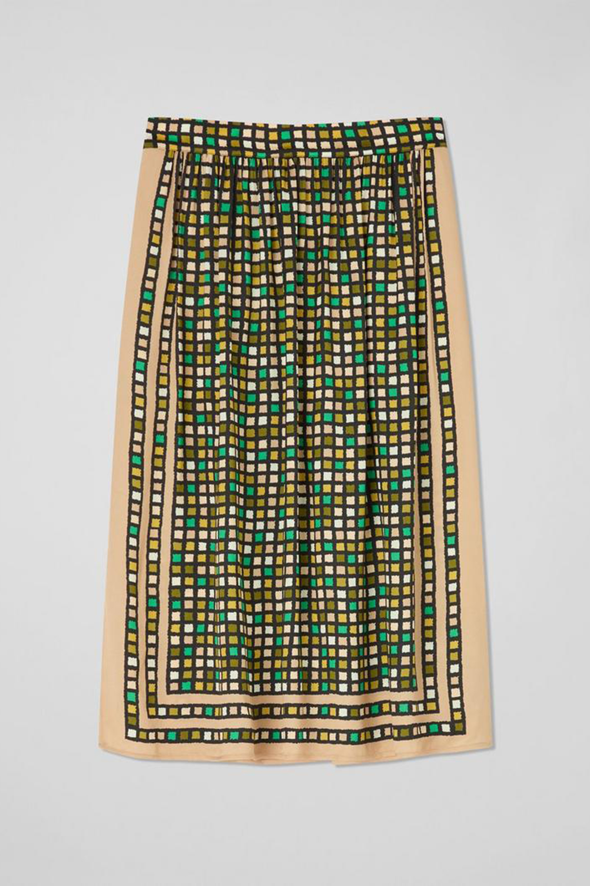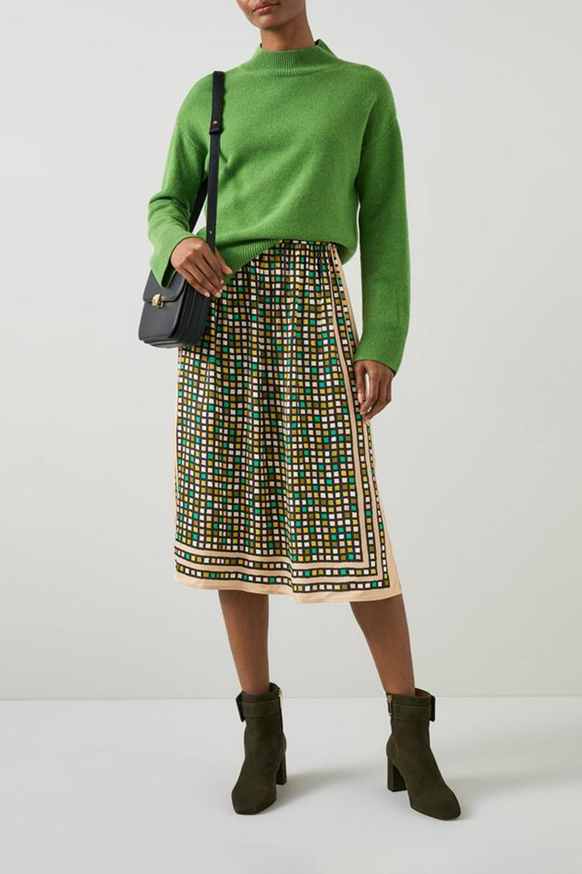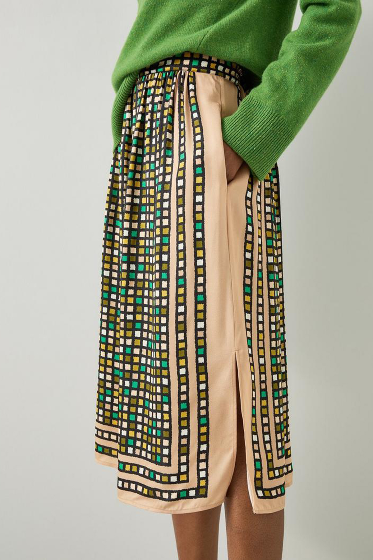 Enter a world of elegance with our skirt. This geometric print A-line skirt is crafted from luxurious viscose, showcasing a geo design perfect for smart casual occasions. Pair it with a crisp white blouse or a cosy jumper for a sophisticated look.