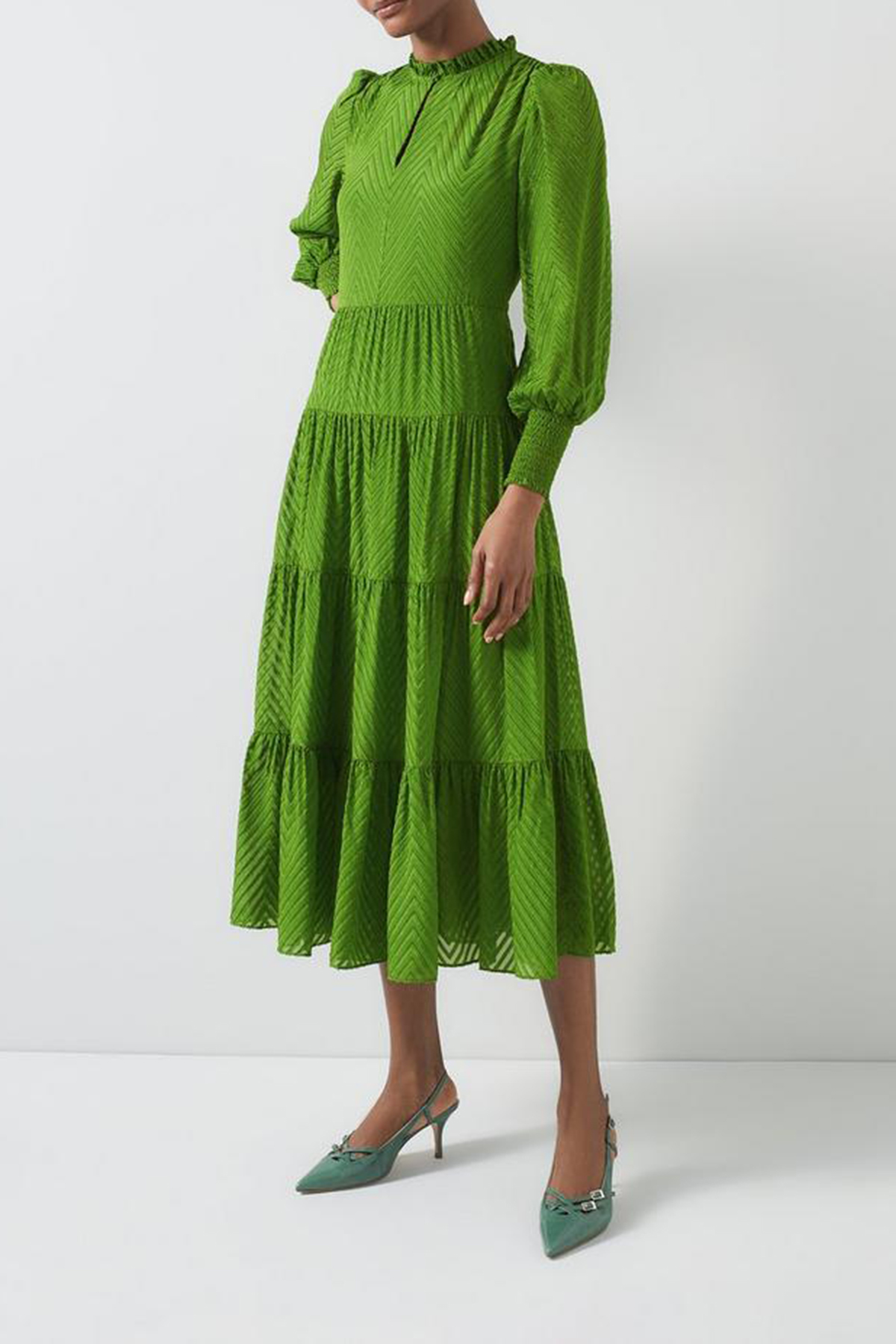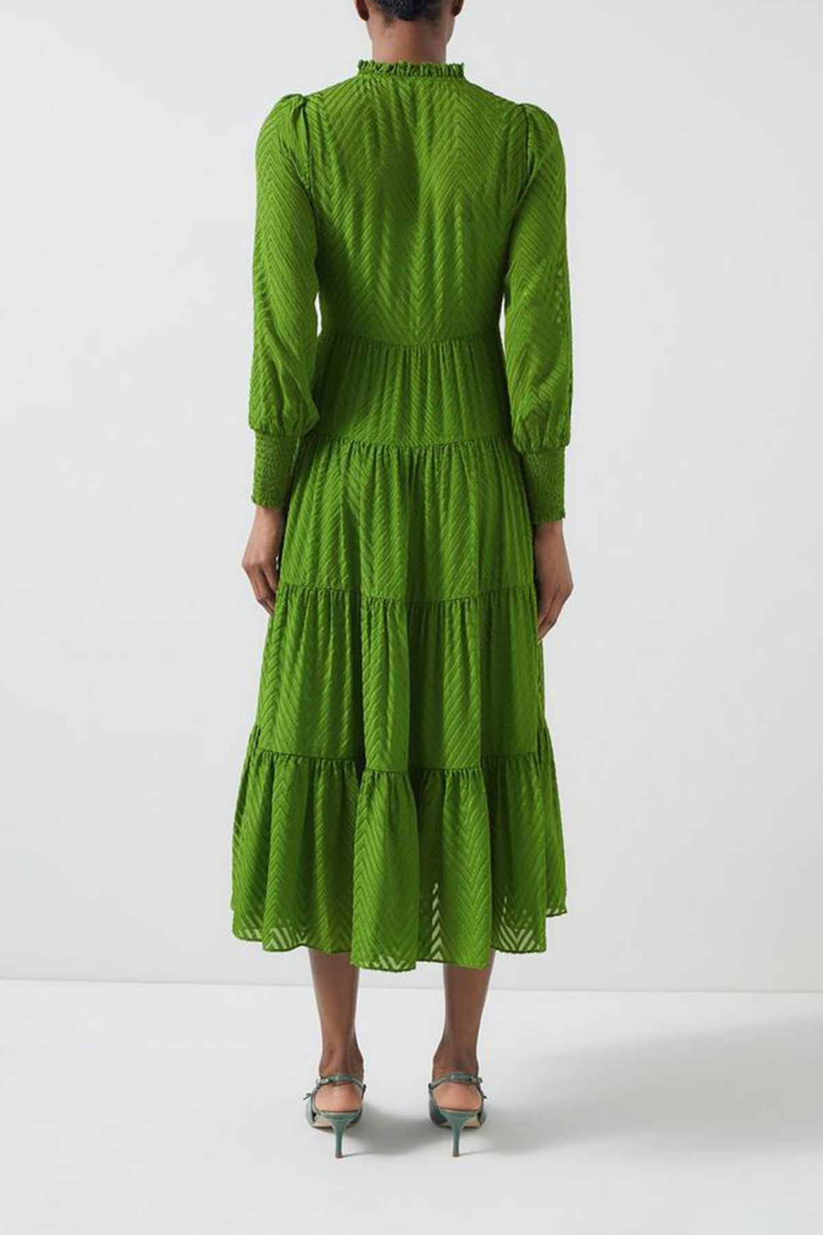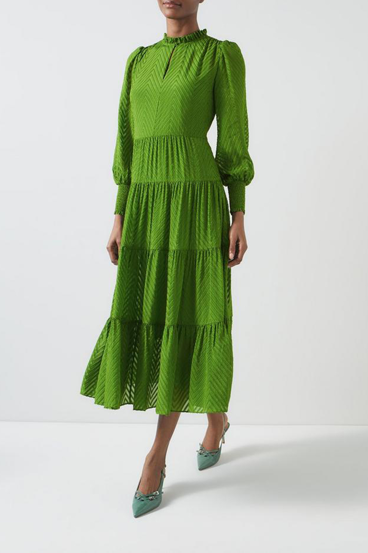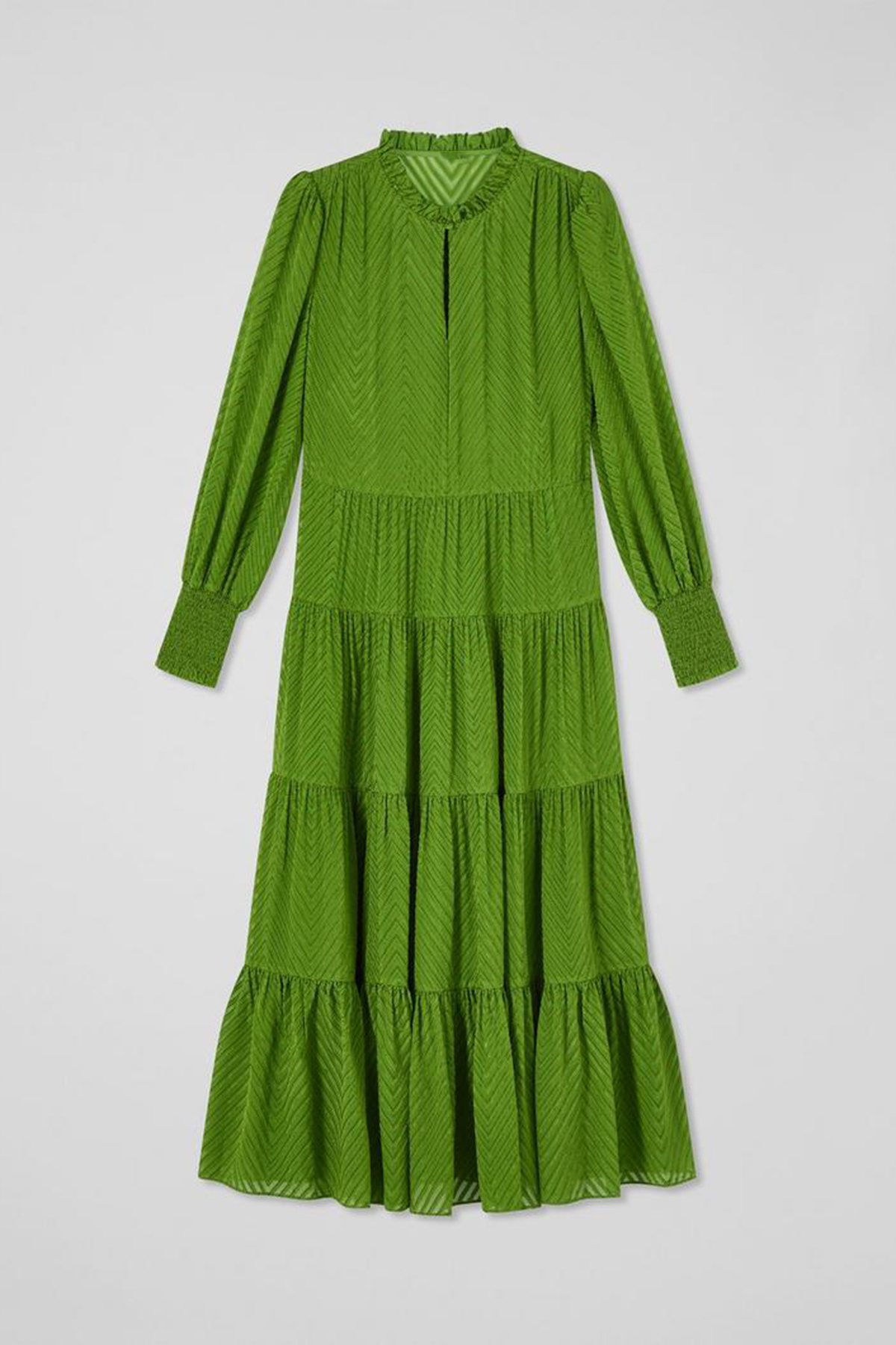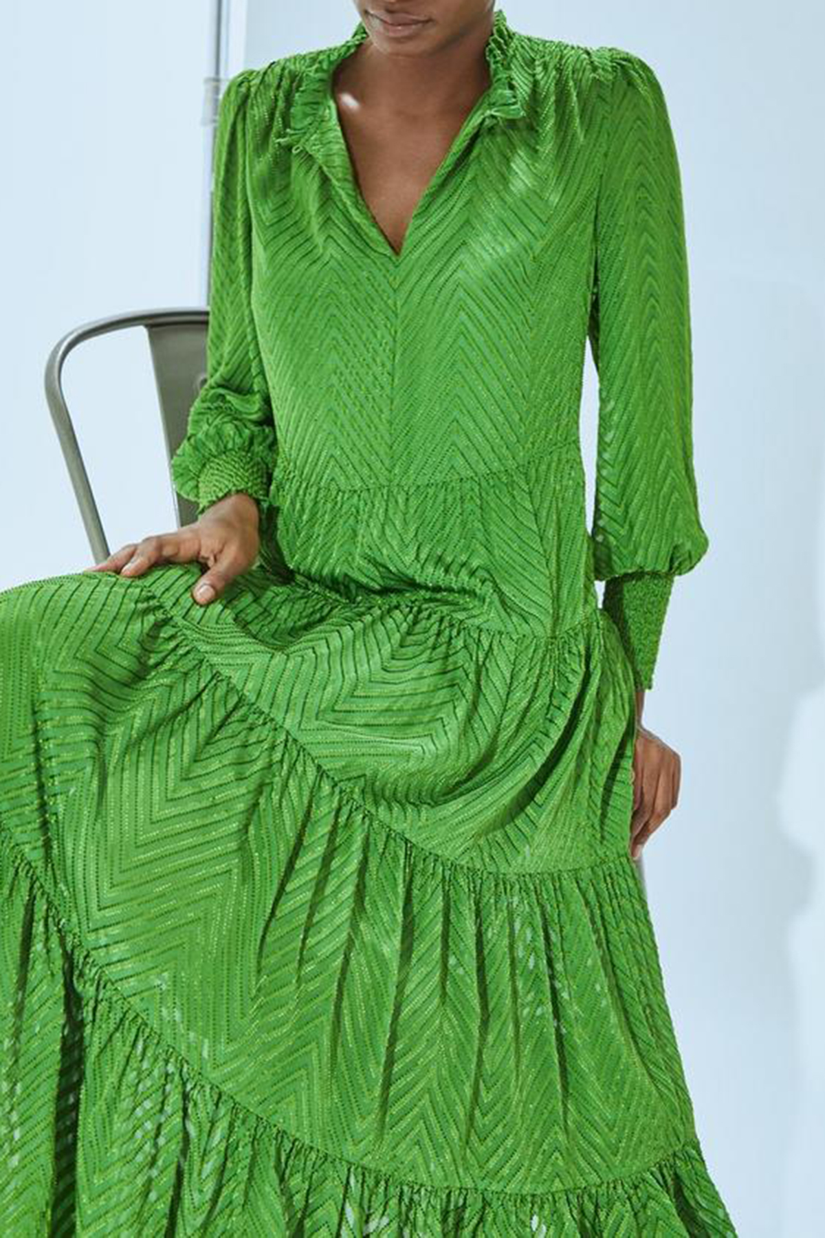 Embrace an evening of elegance with our dress, designed to captivate. In a striking bright green chevron devorè, this silk mix dress features a sophisticated V-neck and full length sleeves, perfect for any special occasion. Pair it with your favourite heels and statement earrings for a flawless look.