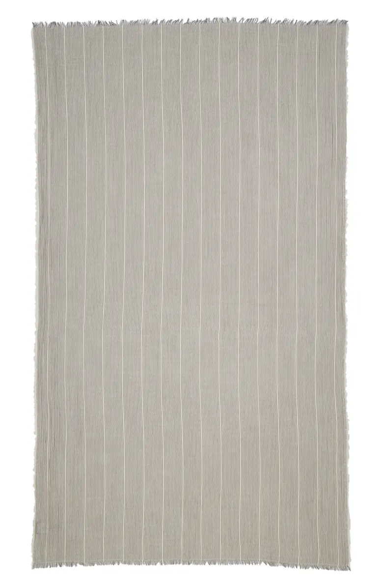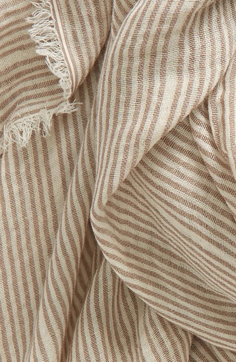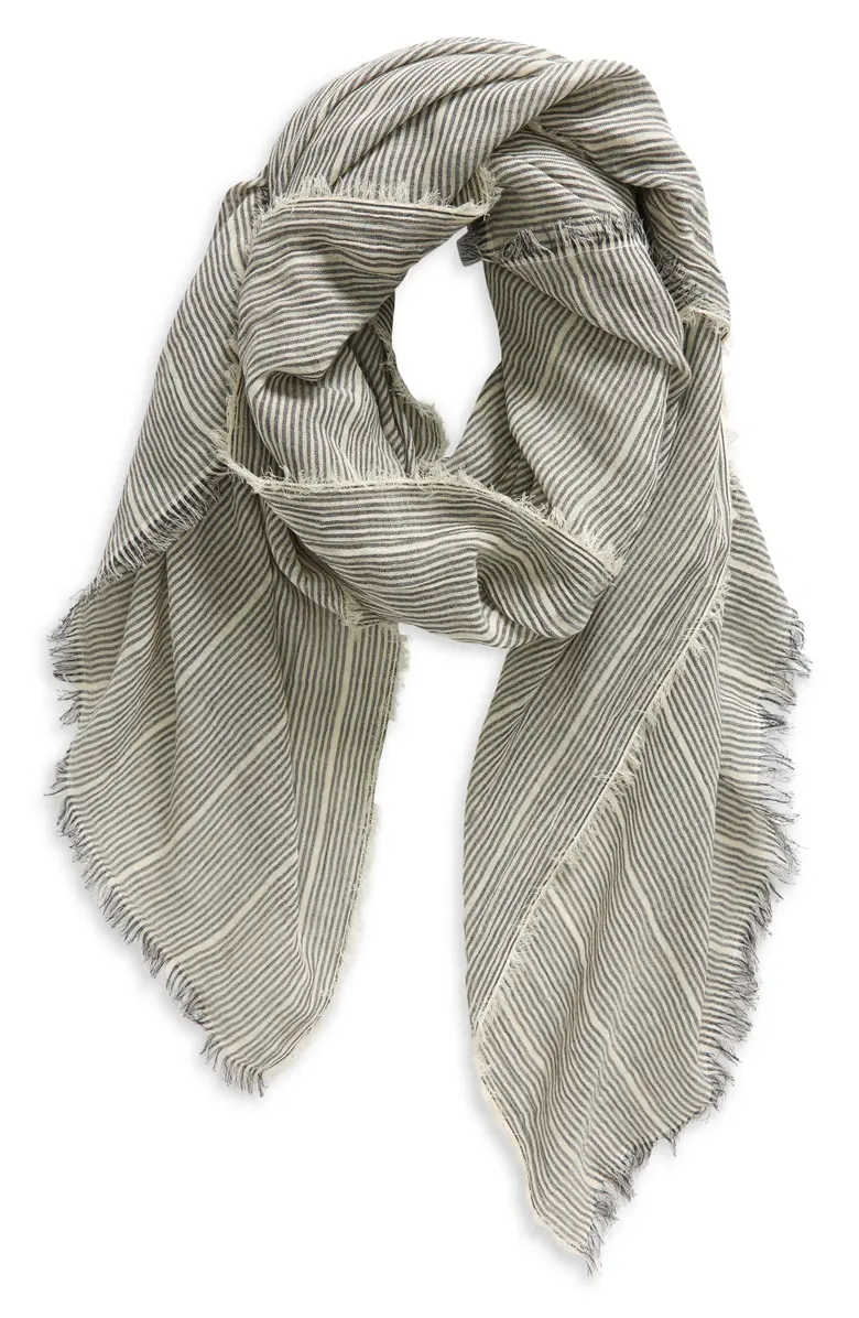 Fine ticking stripes look right at home on the fine, airy cotton of this square, fringe-finished scarf.