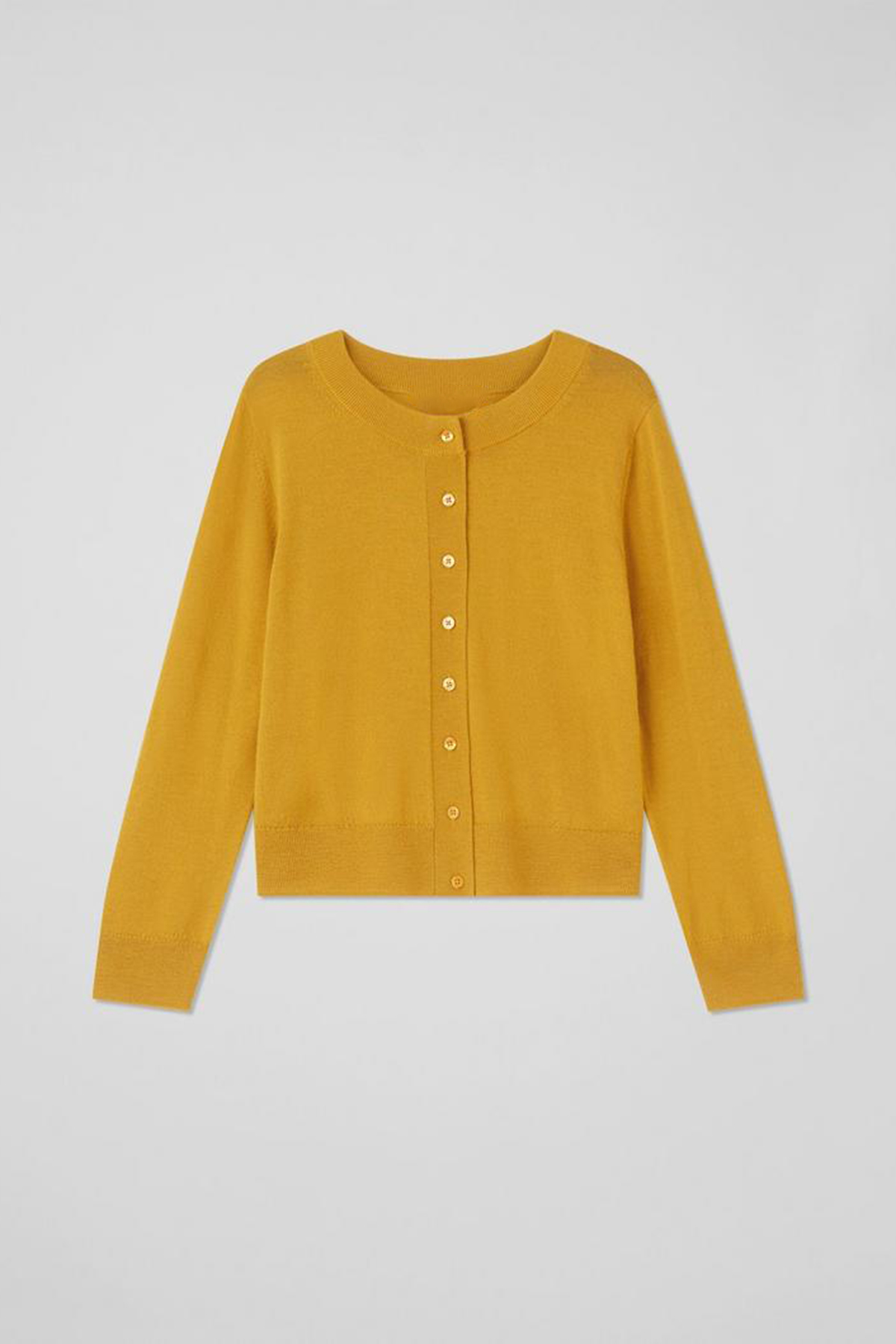 Imagine wrapping up in the cosy feel of our cardigan on a crisp autumn day. In a rich ochre hue, this crew neck wide placket cardigan is knitted from fine wool and features full length sleeves. Perfect for workwear, it pairs well with tailored trousers or a pencil skirt for a sophisticated look.
