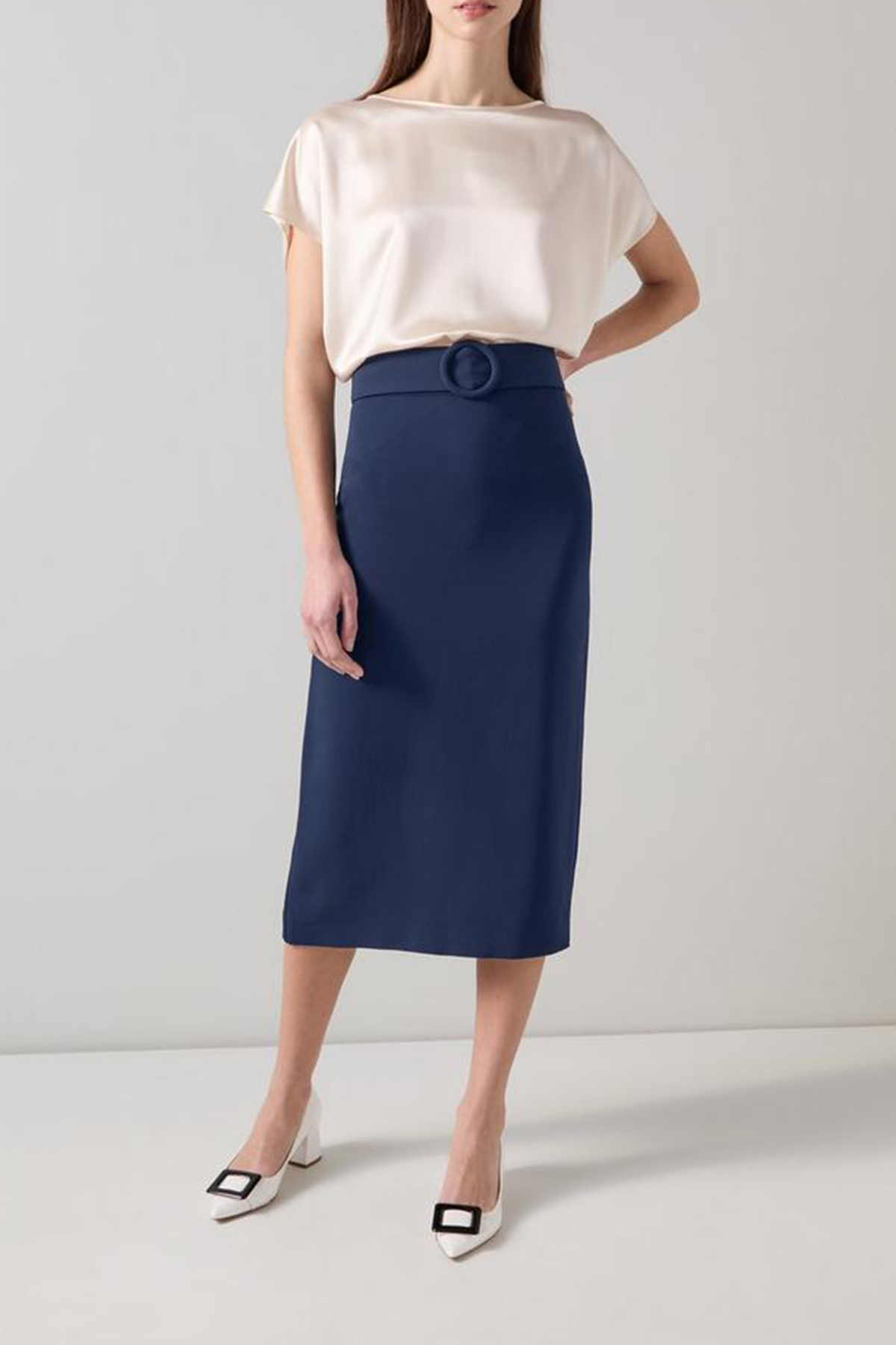 Enhance your office attire with the belted skirt. Made from a soft viscose blend, this skirt includes a detachable belt, flexible crepe fabric, and a reliable zip closure. Its adaptable style complements both blouses and turtlenecks for a polished appearance.