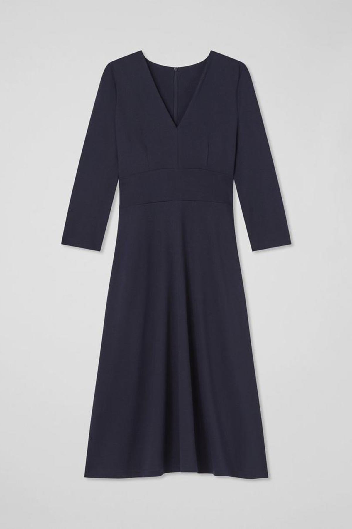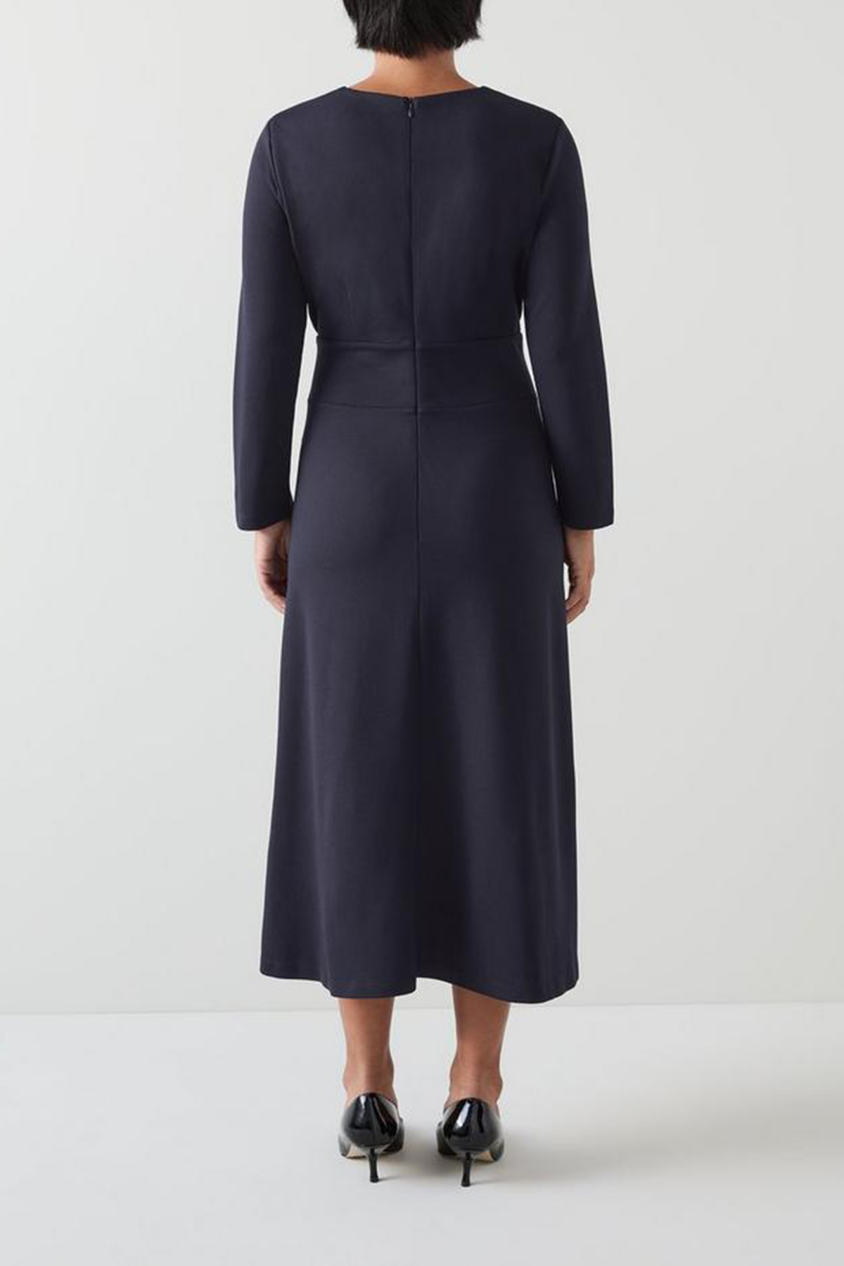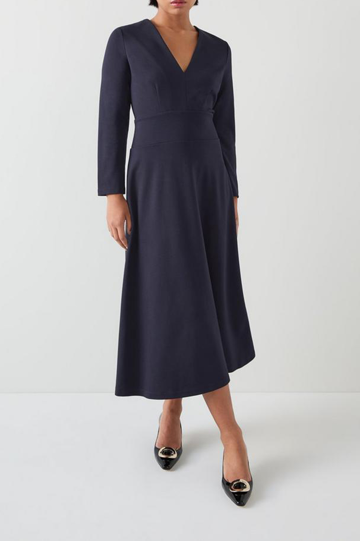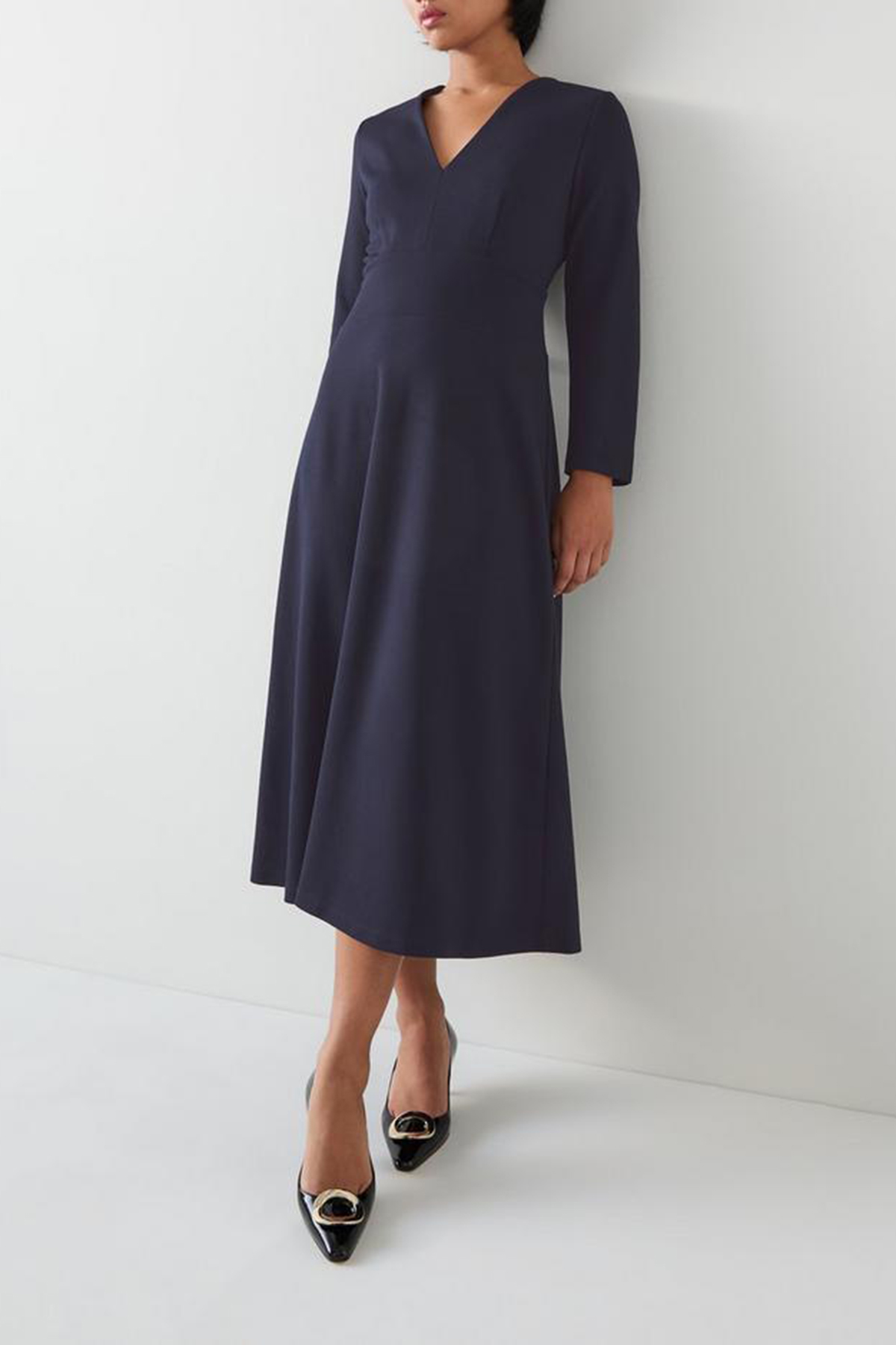 Effortless elegance awaits with our dress, perfect for the modern professional. This navy V-neck ponte midi dress, crafted from a luxurious viscose mix, features a timeless design with full length sleeves for a sophisticated touch. Pair it with your favourite heels for a polished workwear look or dress it down with stylish flats for a smart-casual ensemble.