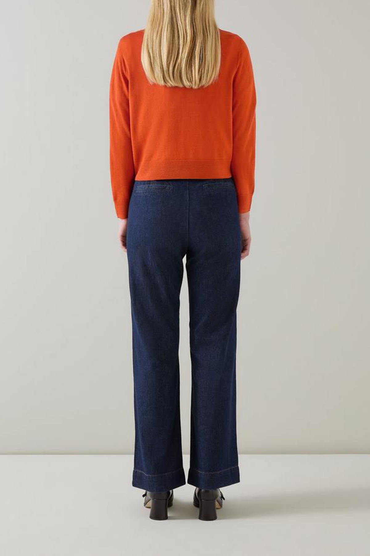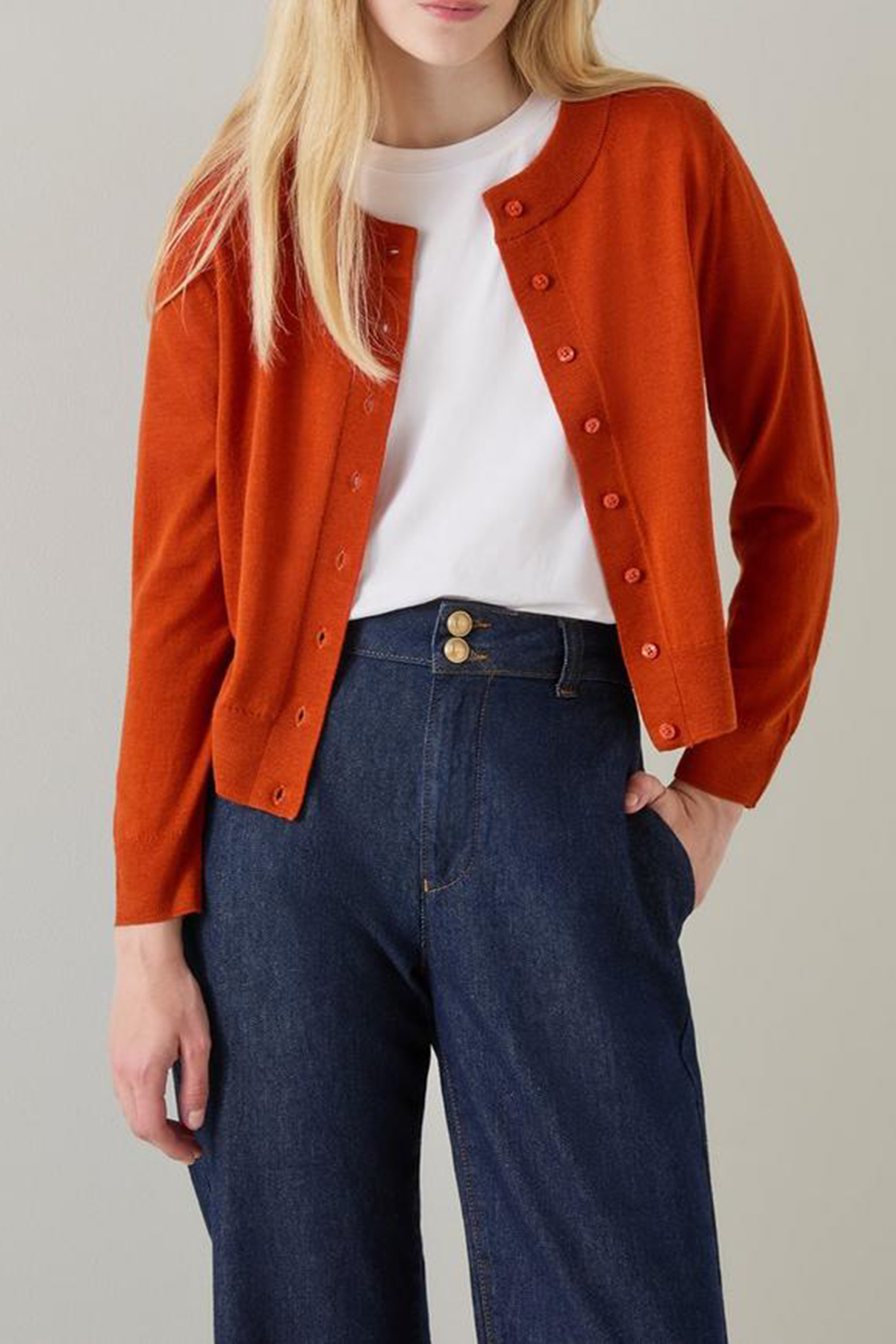 Perfect for cosy office days, the crew neck wide placket cardigan in burnt orange adds a pop of warmth to your workwear wardrobe. Made from luxurious wool, this plain knitted piece features a classic crew neck and elegant full length sleeves. Pair it effortlessly with tailored trousers or a sophisticated pencil skirt.