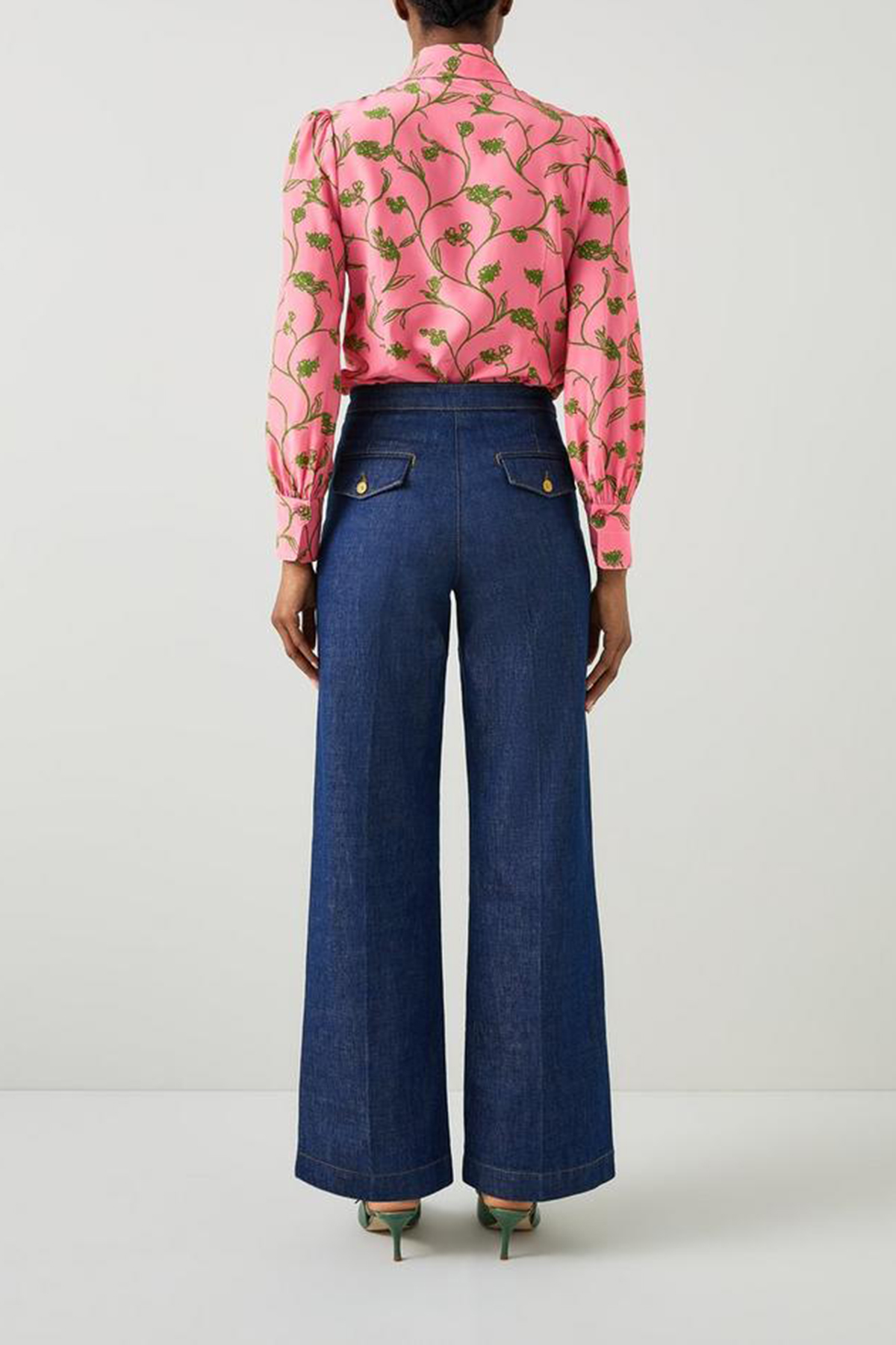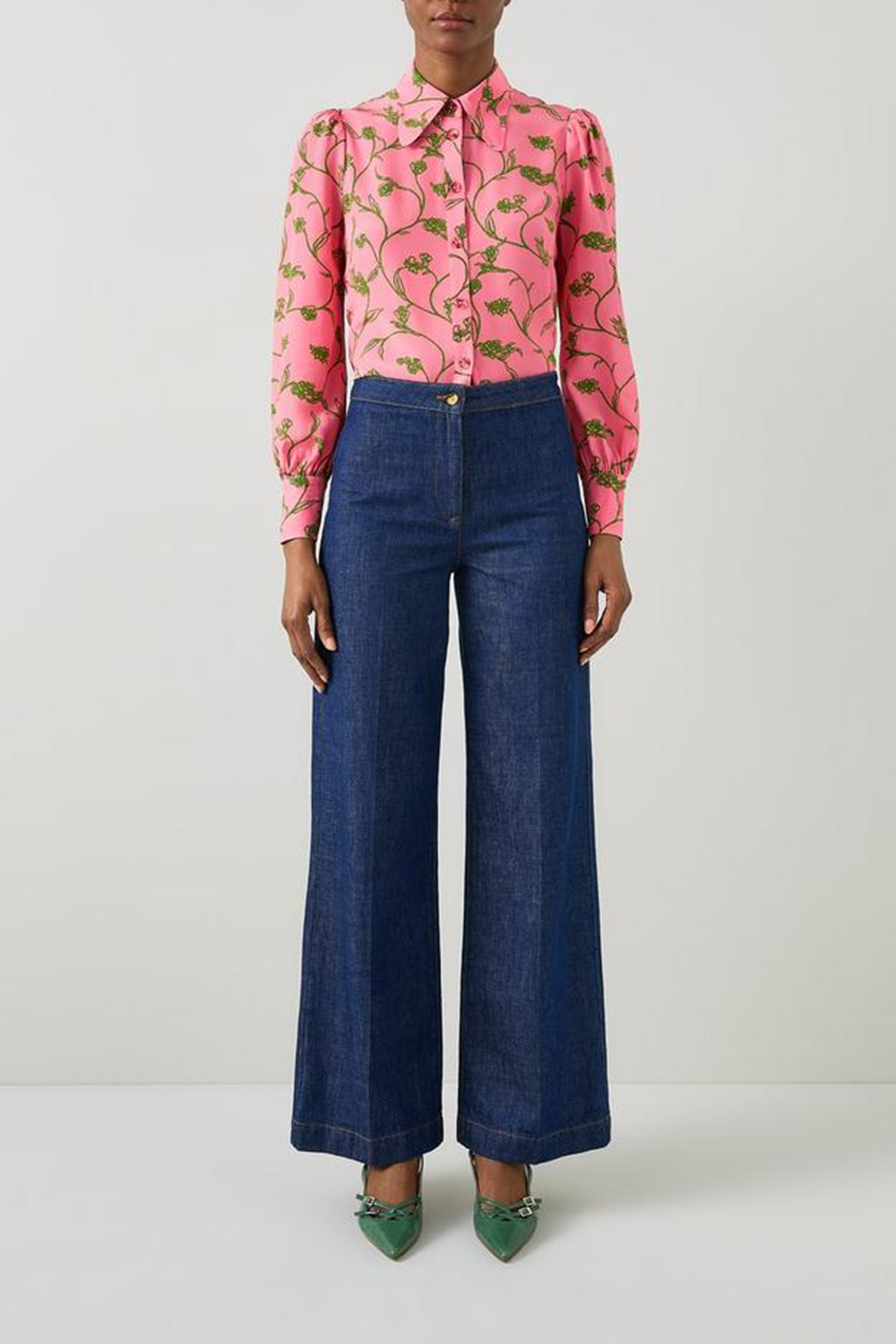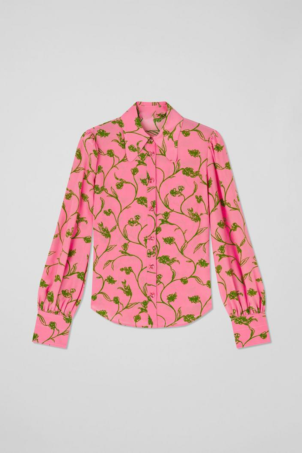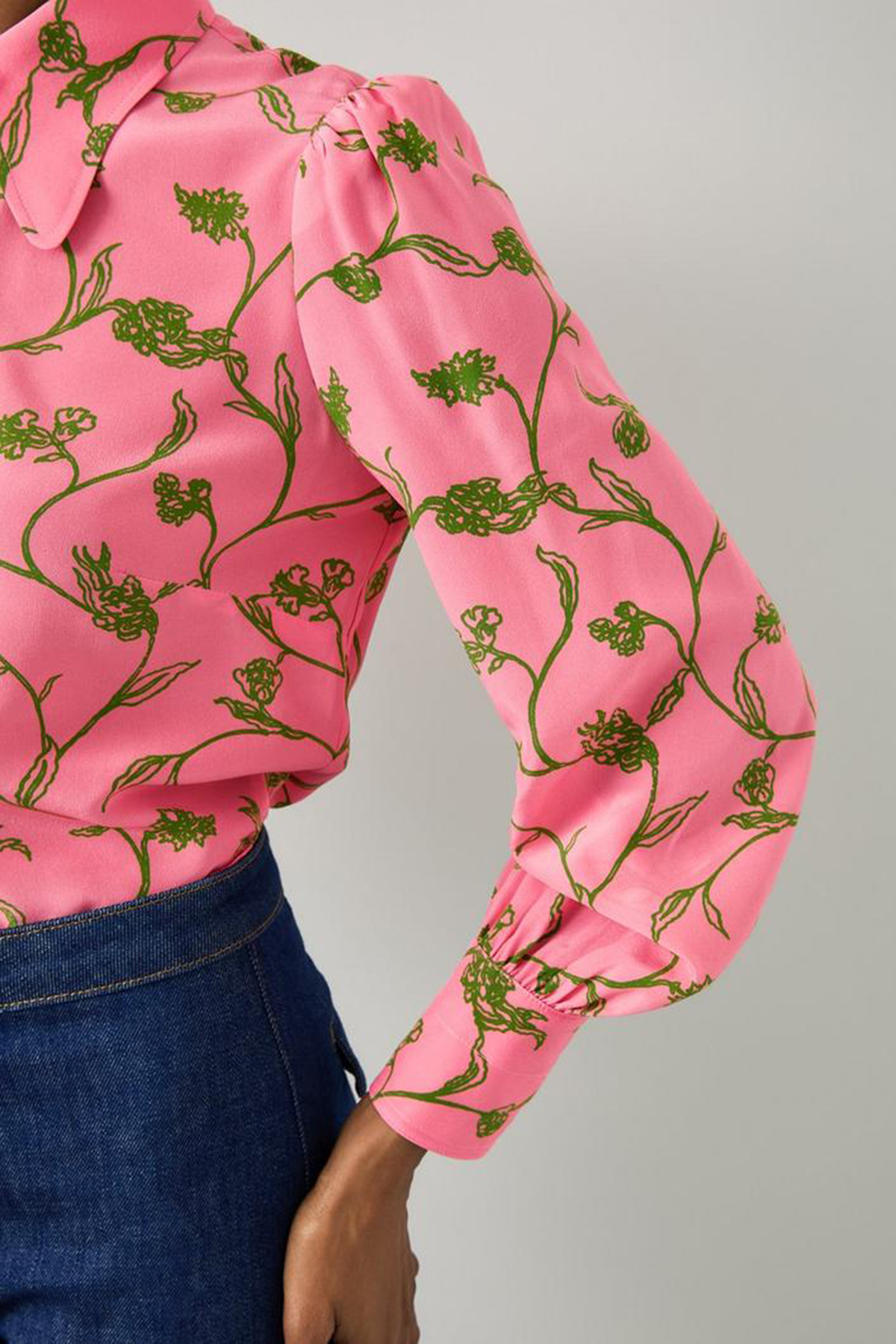 A garden of elegance with our sketchy flower print blouse in pink and green. This silk marvel features a delightful floral design, full length sleeves, and a sophisticated collar, perfect for smart casual outings. Pair it effortlessly with tailored trousers or a stylish skirt for a timeless look.