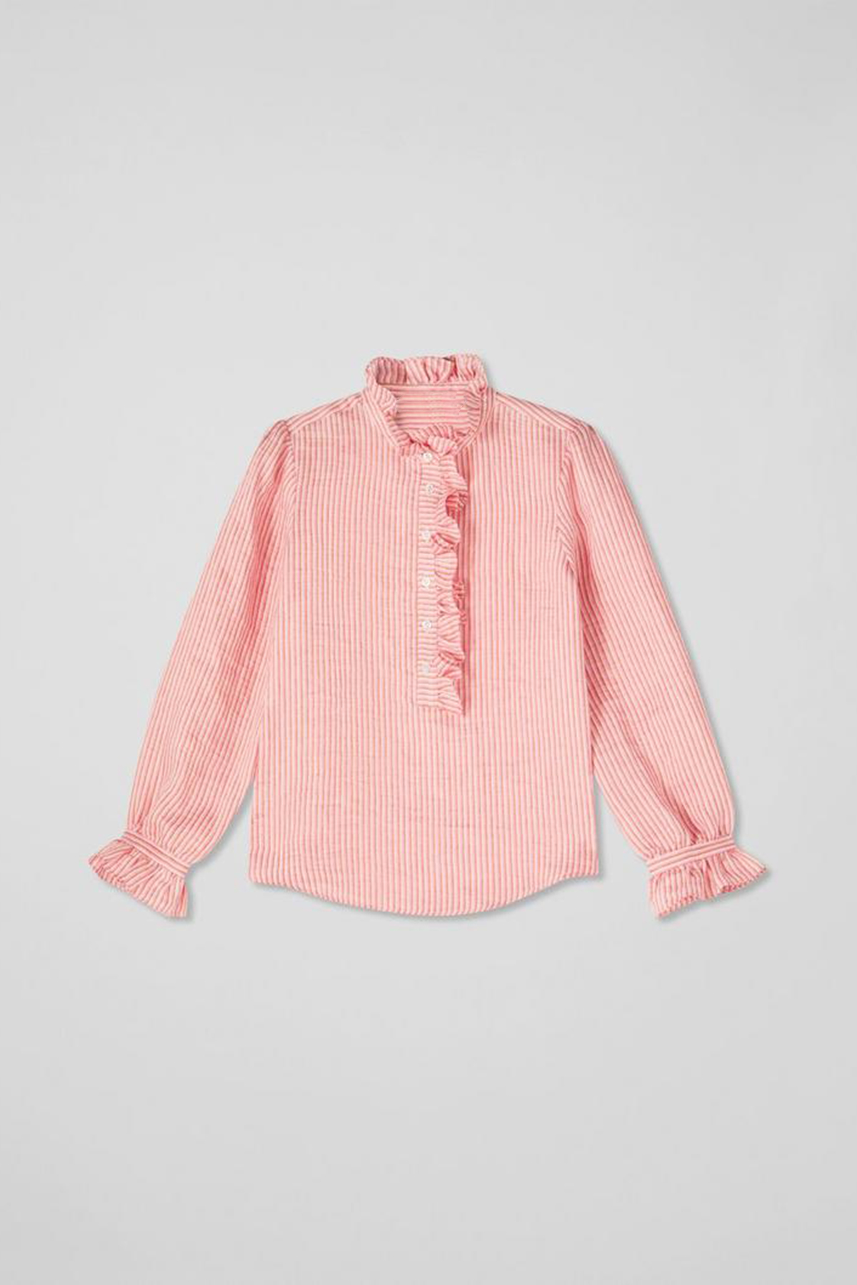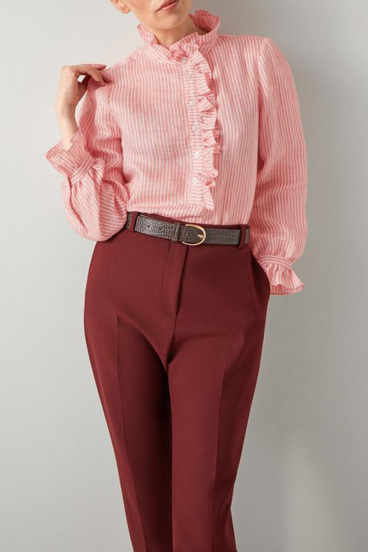 Add a touch of elegance to your wardrobe with our linen blend blouse. Designed in a pink and camel stripe linen blend, it features a stand frill collar and full length sleeves, perfect for smart casual occasions. Pair it effortlessly with tailored trousers or your favourite jeans for a sophisticated look.