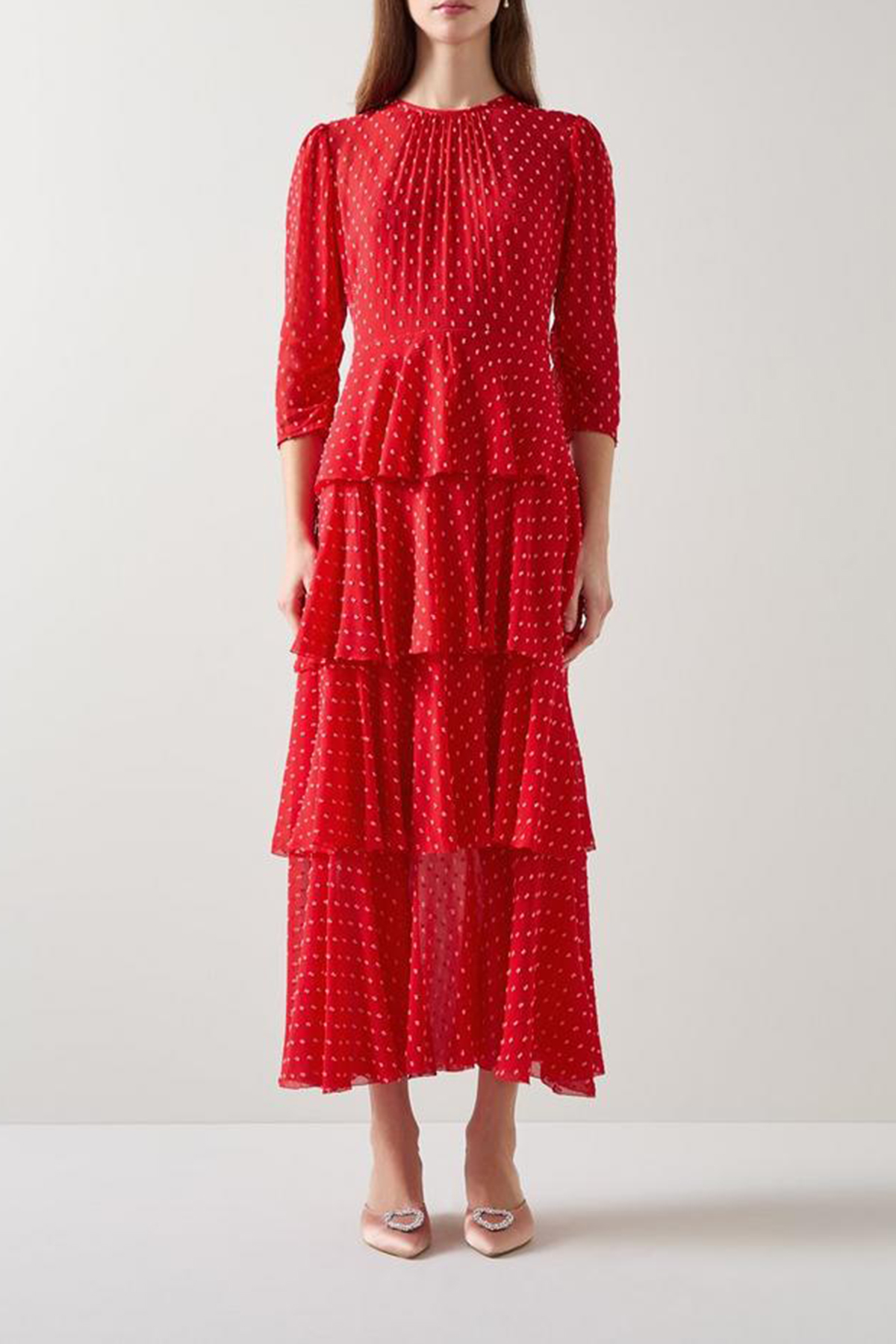 Dress is a textured spot crinkle tiered dress in poinsettia. Made from a viscose blend with picot edging details, it is perfect for special moments. Pair with statement earrings and strappy heels for an unforgettable evening look.