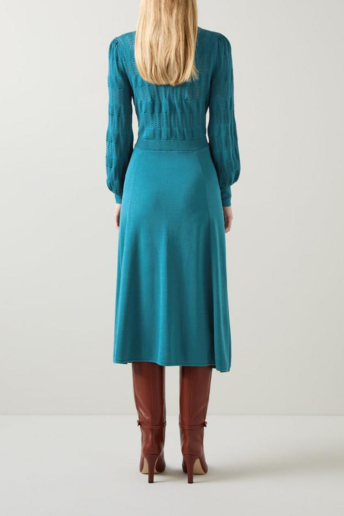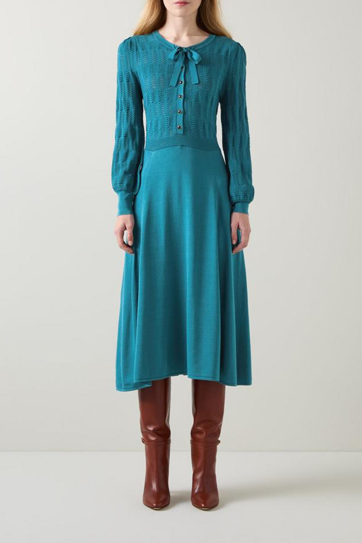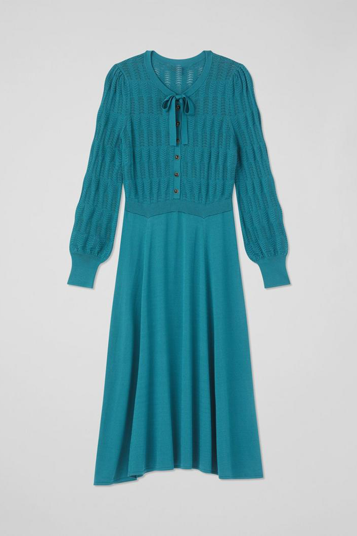 Effortless elegance with this dress. In a stunning green viscose mix, it features a scoop neck, pointelle knit design, and charming neck tie with buttons. Perfectly versatile, it pairs beautifully with both polished heels and casual flats.