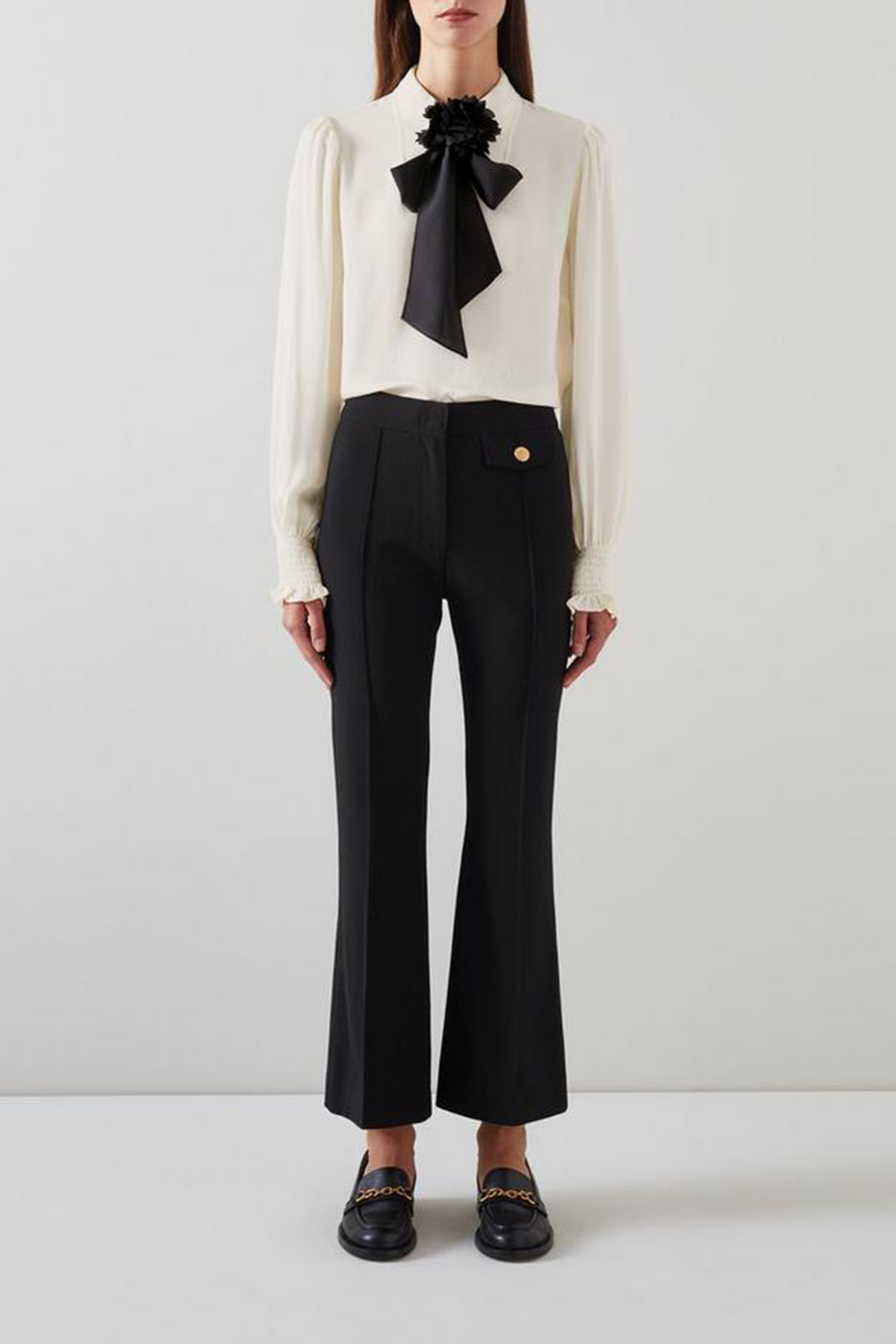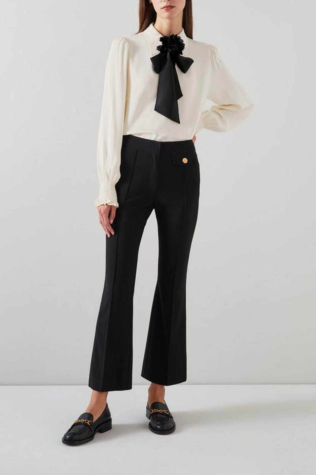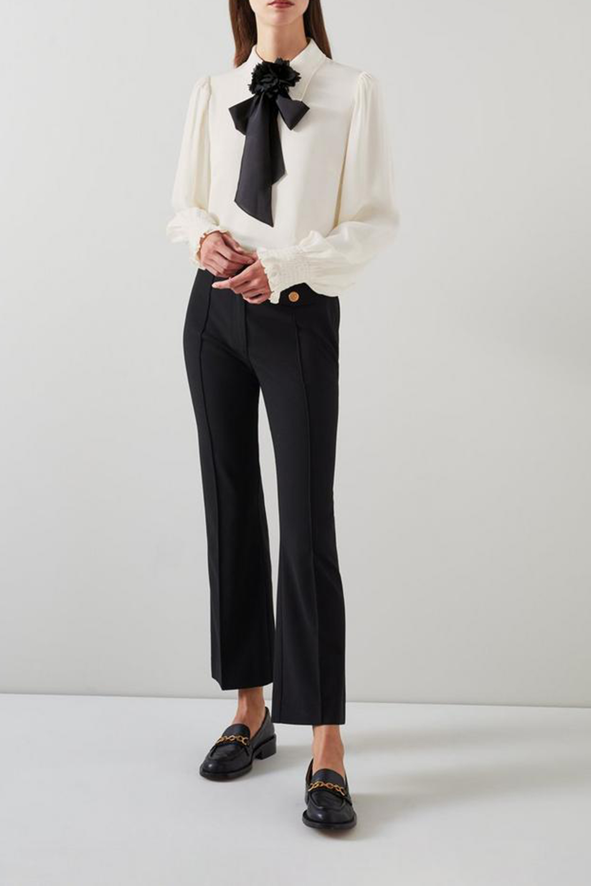 Imagine stepping into the epitome of sophistication with our crepe blouse. In an elegant cream hue, this viscose top features a removable neck tie and corsage, complemented by front poppers and a classic collar. Perfectly versatile, it pairs effortlessly with tailored trousers for the office or your favourite jeans for a polished casual look.