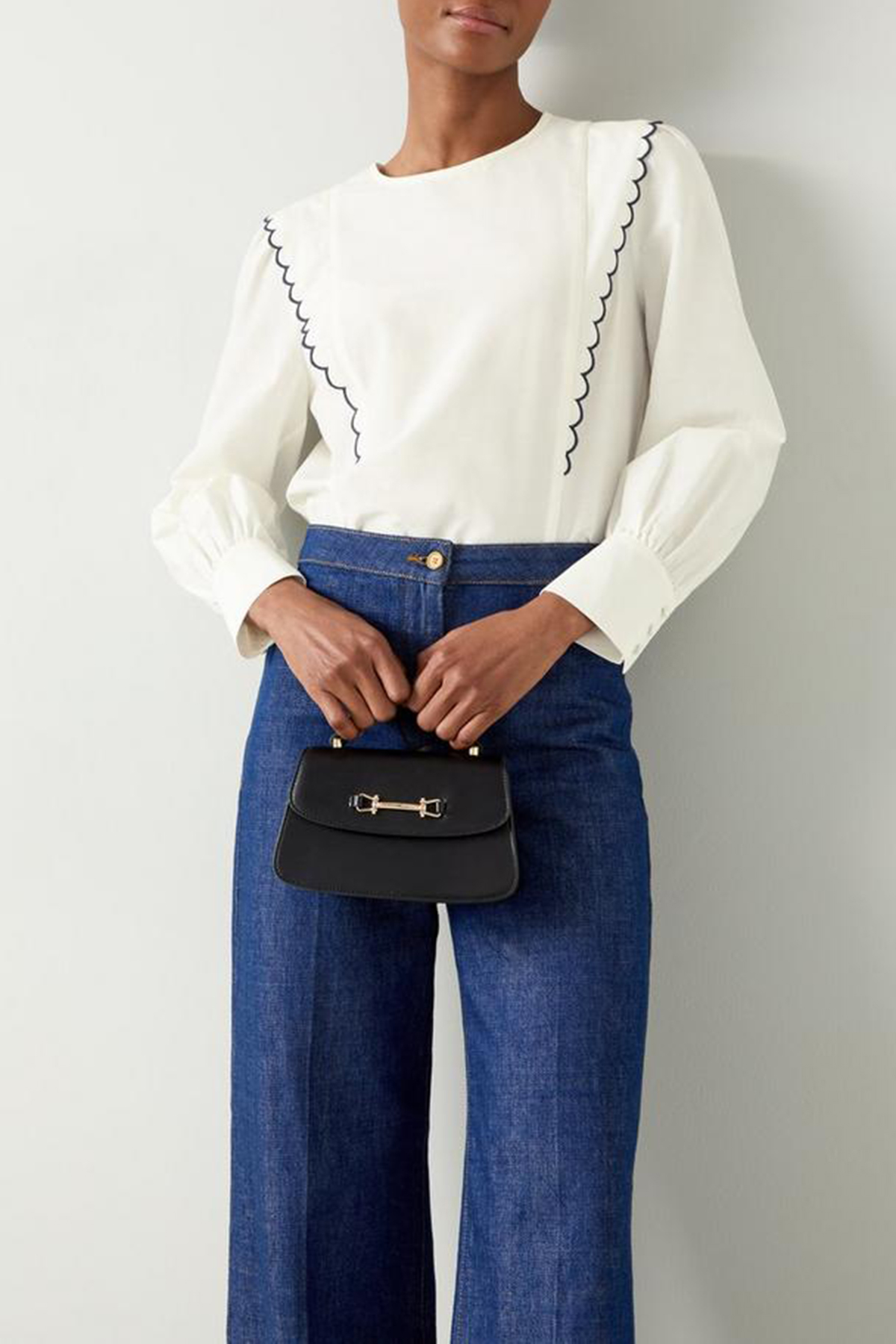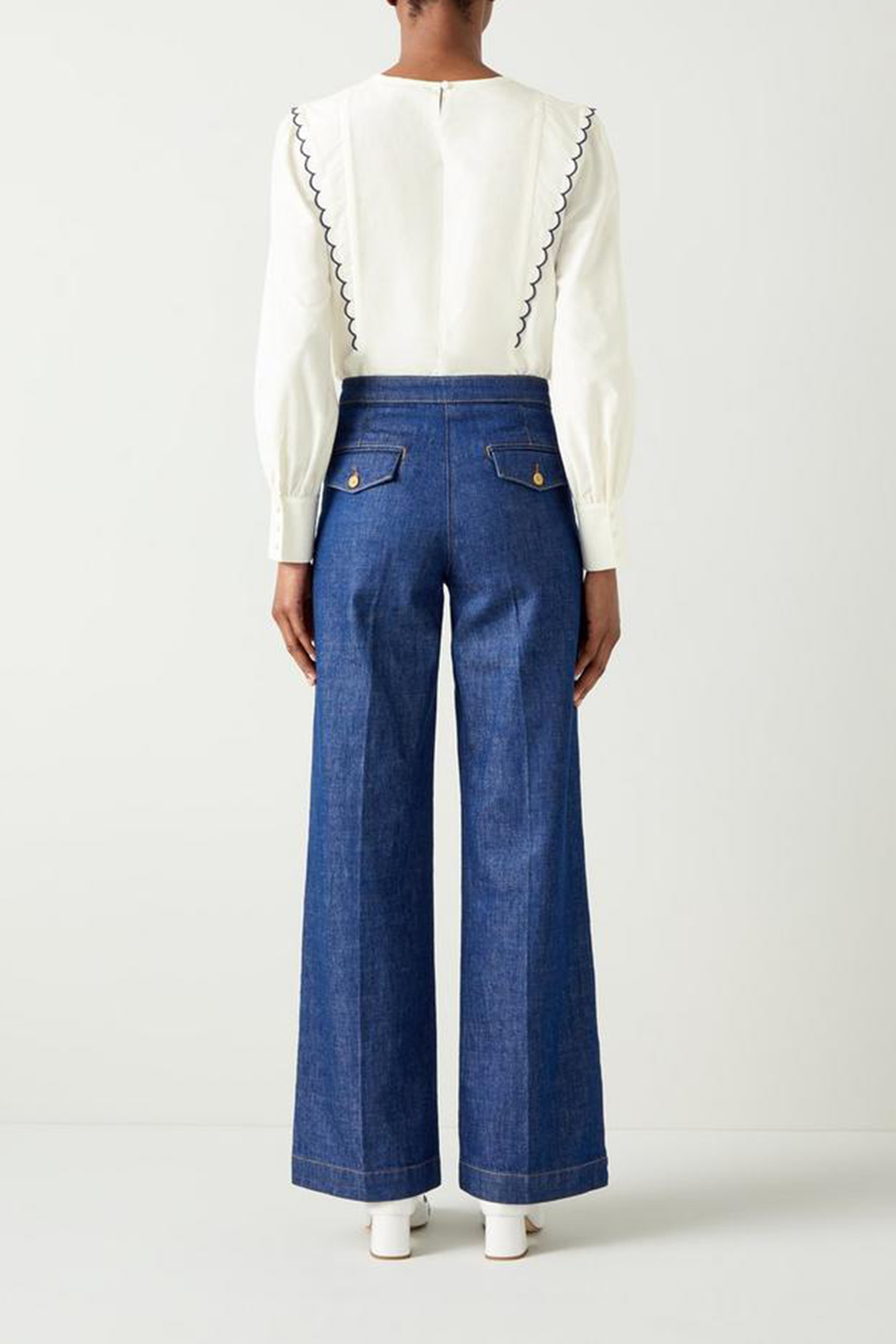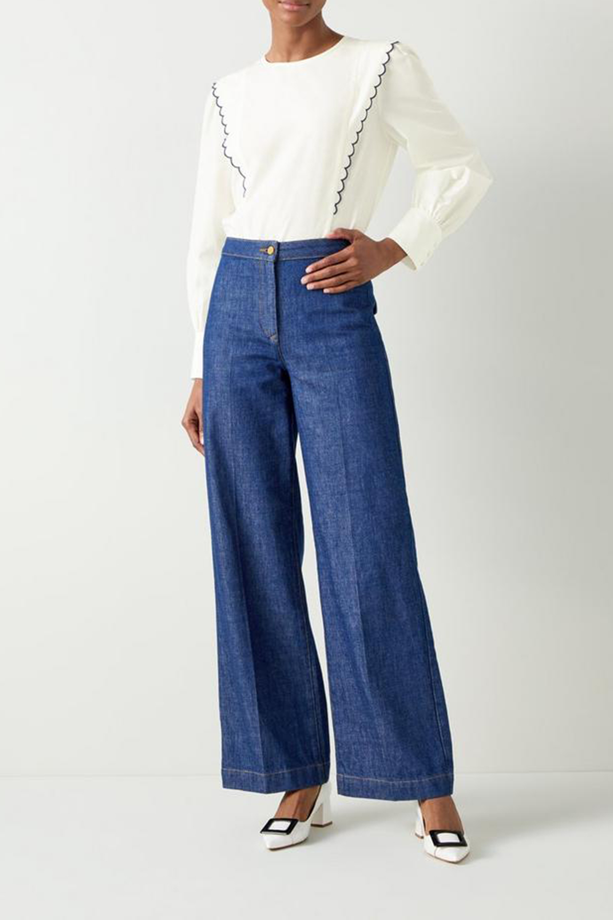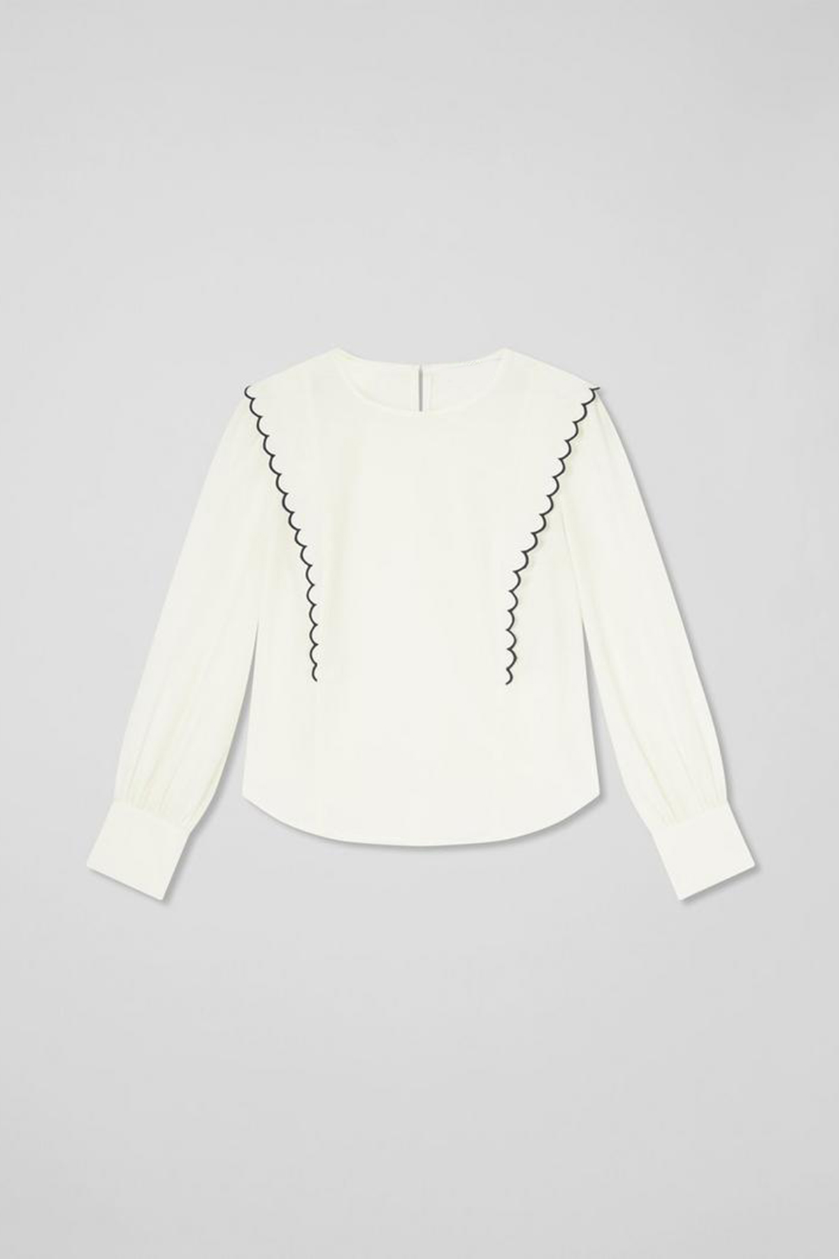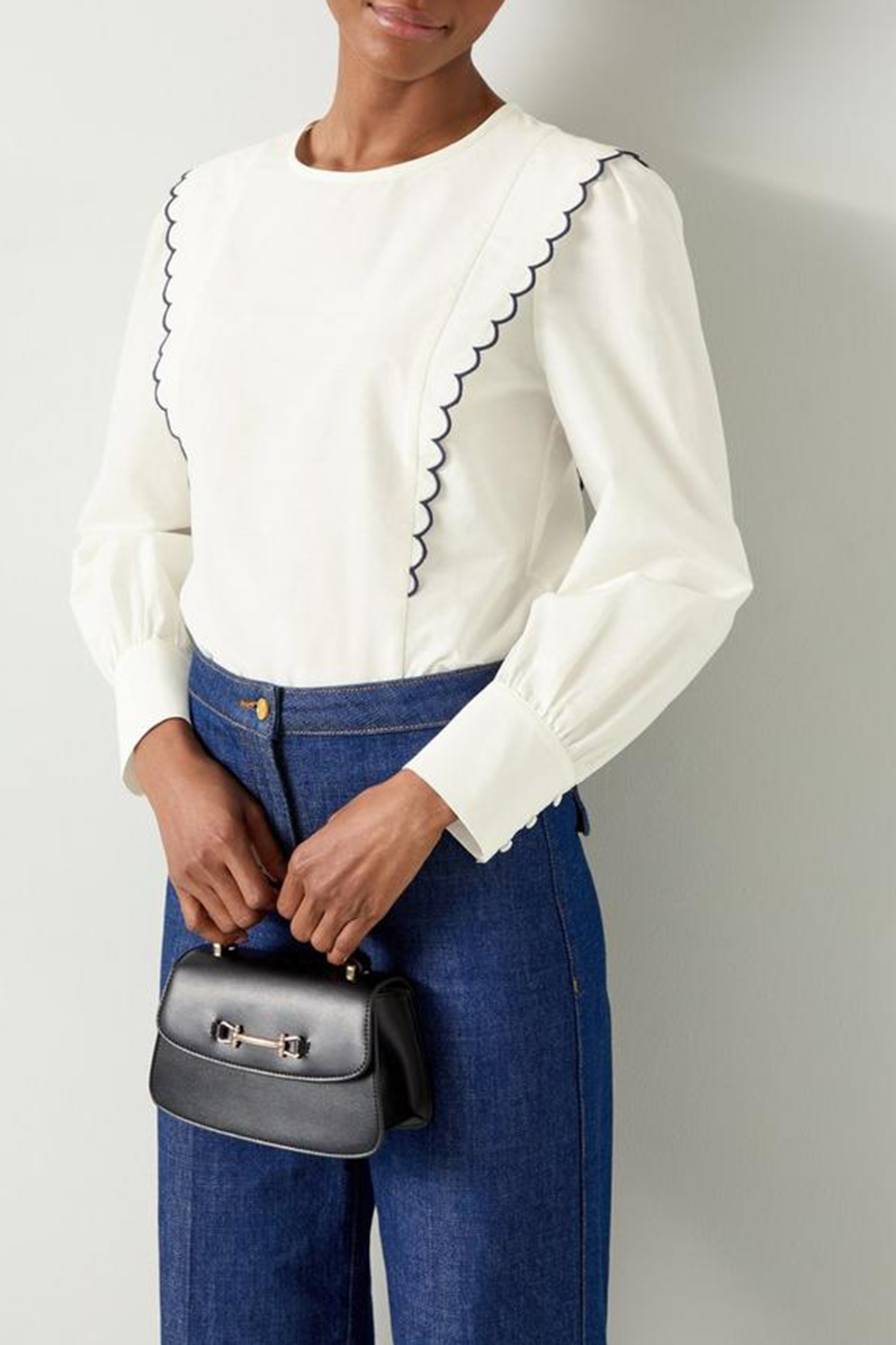 The silk cotton blouse in ecru features a luxurious silk blend with embroidered scallop details and button accents. This crew neck, full length sleeves top is perfect for both office and evening settings, pairing effortlessly with trousers or midi skirts.